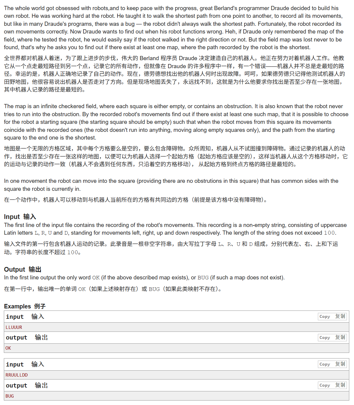 {vis[110][110] = 1;int x = 110;int y = 110;cin >> a;for (int i = 0; i < a.size(); i++){if (a[i] == 'L'){y--;if (!vis[x][y]){vis[x][y] = 1;int t = 0;if (vis[x][y + 1])t++;if (vis[x + 1][y])t++;if (vis[x - 1][y])t++;if (vis[x][y - 1])t++;if (t >= 2){cout << "BUG" << endl;return;}}else{cout << "BUG" << endl;return;}}if (a[i] == 'R'){y++;if (!vis[x][y]){vis[x][y] = 1;int t = 0;if (vis[x][y + 1])t++;if (vis[x + 1][y])t++;if (vis[x - 1][y])t++;if (vis[x][y - 1])t++;if (t >= 2){cout << "BUG" << endl;return;}}else{cout << "BUG" << endl;return;}}if (a[i] == 'U'){x--;if (!vis[x][y]){vis[x][y] = 1;int t = 0;if (vis[x][y + 1])t++;if (vis[x + 1][y])t++;if (vis[x - 1][y])t++;if (vis[x][y - 1])t++;if (t >= 2){cout << "BUG" << endl;return;}}else{cout << "BUG" << endl;return;}}if (a[i] == 'D'){x++;if (!vis[x][y]){vis[x][y] = 1;int t = 0;if (vis[x][y + 1])t++;if (vis[x + 1][y])t++;if (vis[x - 1][y])t++;if (vis[x][y - 1])t++;if (t >= 2){cout << "BUG" << endl;return;}}else{cout << "BUG" << endl;return;}}}cout << "OK" << endl;return;