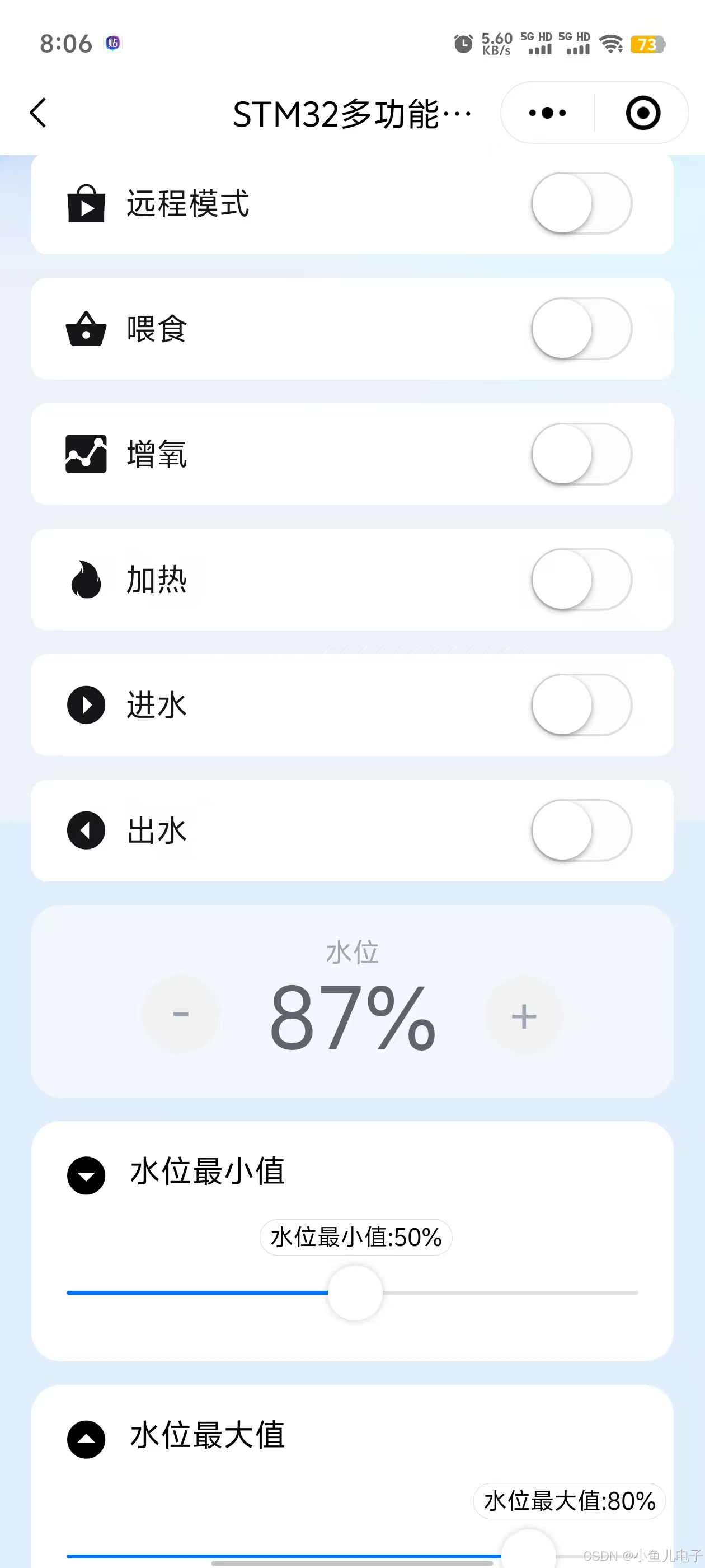 6、手动模式:可以通过手机端小程序控制加热、进水、出水、增氧、喂食的状态的打开与关闭和模式切换