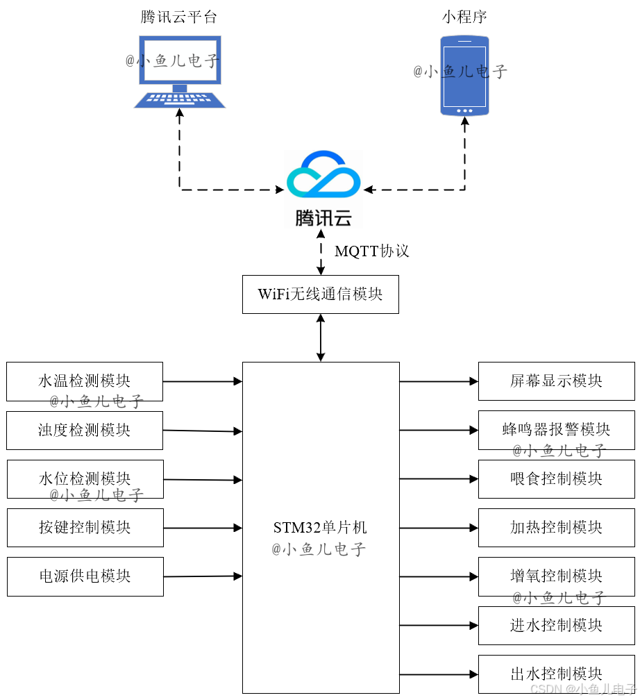 基于STM32的多功能鱼缸分为三部分,分别为设备感知层、数据传输层和用户应用层。设备感知层由STM32单片机、水温传感器、浊度传感器、水位传感器、加热设备、换水设备、增氧设备、喂食模块、OLED显示屏和蜂鸣器构成,其中STM32单片机负责传感器数据的采集、存储和处理。数据传输层主要采用WiFi无线通信技术接入家庭路由器网络将监测的鱼缸数据上传至腾讯物联网云平台进行数据交互。应用层由用户在手机端远程进行鱼缸实时数据的查看、阈值的设定、远程控制设备、接收预警和定时喂食等功能。