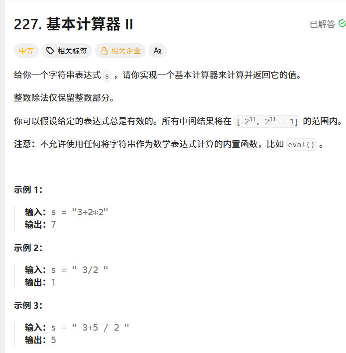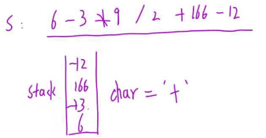 class Solution {public int calculate(String s1) {Stack<Integer> stack=new Stack();char[] s=s1.toCharArray();int i=0;int n=s1.length();char signal='+';while(i<n){if(s[i]==' '){i++;}else if(s[i]>='0' && s[i]<='9'){int tem=0;while(i<n && s[i]>='0' && s[i]<='9'){tem=tem*10+(s[i]-'0');i++;}if(signal=='+'){stack.push(tem);}if(signal=='-'){stack.push(-tem);}if(signal=='*'){stack.push(stack.pop()*tem);}if(signal=='/'){stack.push(stack.pop()/tem);}}else{signal=s[i];i++;}}int ret=0;while(!stack.isEmpty()){ret+=stack.pop();}return ret;}