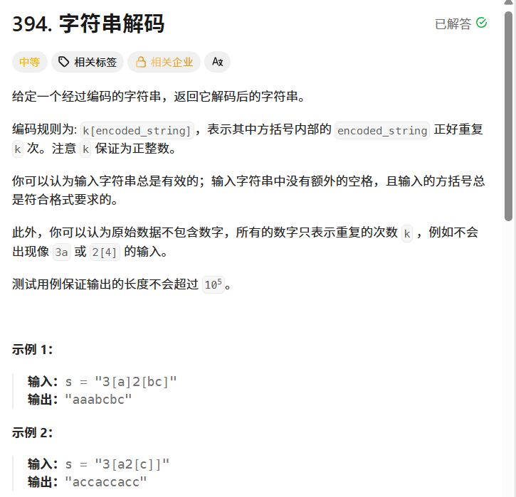 class Solution {public String decodeString(String s1) {Stack<String> stackString=new Stack<>();Stack<Integer> stackInteger=new Stack<>();stackString.push("");char[] s=s1.toCharArray();int i=0;int n=s1.length();while(i<n){if(s[i]>='0' && s[i]<='9'){int tem=0;while(i<n && s[i]>='0' && s[i]<='9'){tem=tem*10+(s[i]-'0');i++;}stackInteger.push(tem);}else if(s[i]=='['){stackString.push("");i++;}else if(s[i]==']'){int num=stackInteger.pop();String ret1=stackString.pop();ret1=ret1.repeat(num);String prev=stackString.pop();stackString.push(prev+ret1);i++;}else if(s[i]>='a' && s[i]<='z'){String p="";while(i<n && s[i]>='a' && s[i]<='z'){p+=s[i];i++;}stackString.push(stackString.pop()+p);}}return stackString.pop();}