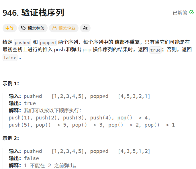class Solution {public boolean validateStackSequences(int[] pushed, int[] popped) {Stack<Integer> stack=new Stack<>();int i=0;int n=pushed.length;int j=0;while(i<n){stack.push(pushed[i]);while(!stack.isEmpty() && stack.peek()==popped[j] ){stack.pop();j++;}i++;}return stack.isEmpty();}