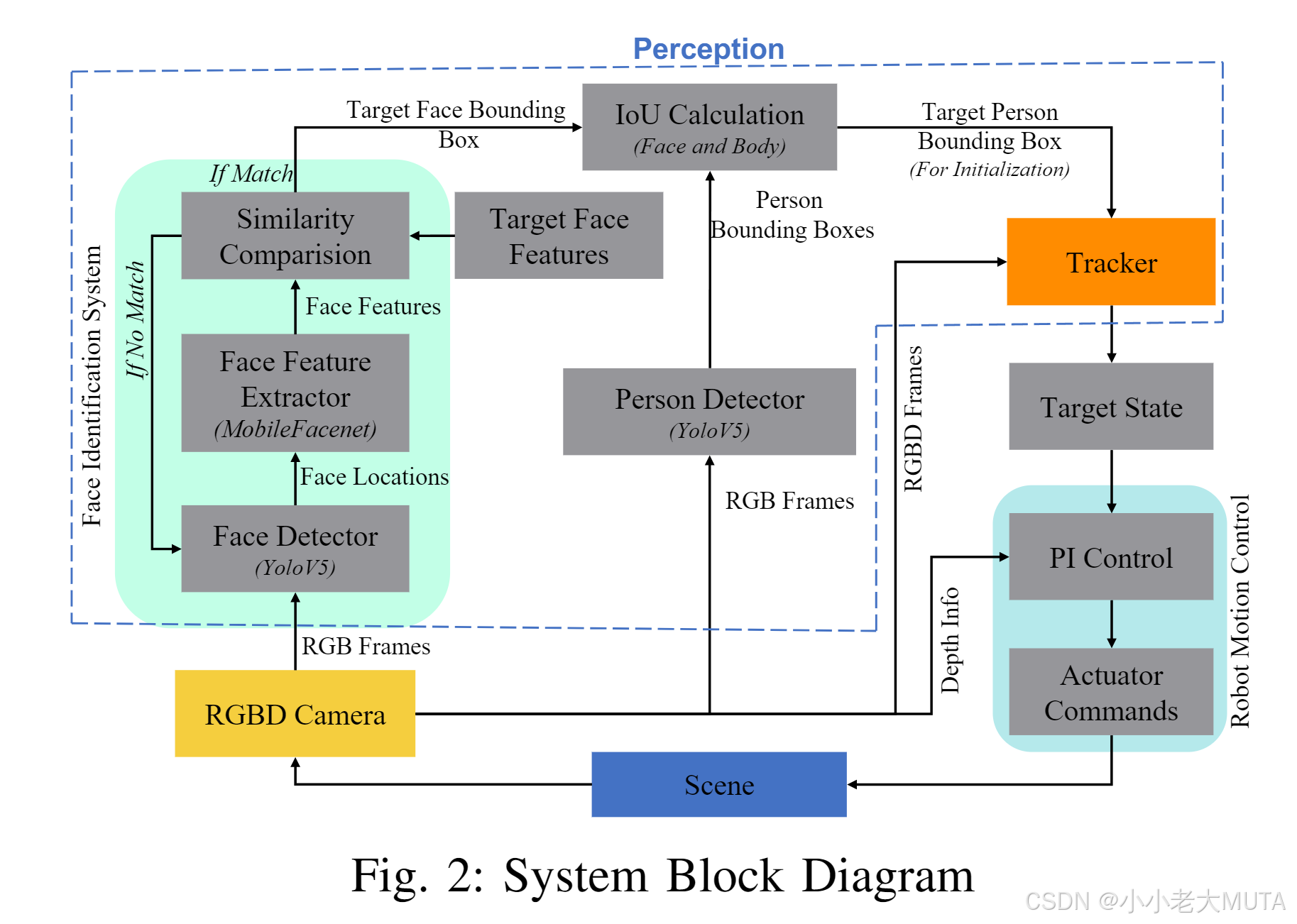 本节介绍我们设计的机器人人物跟随系统的整体流程与组成部分,如图2所示。我们提出的机器人跟随系统是一个完全自主的系统,包含两个主要模块:感知模块(包括人脸识别、人物检测和跟踪)和机器人运动控制。