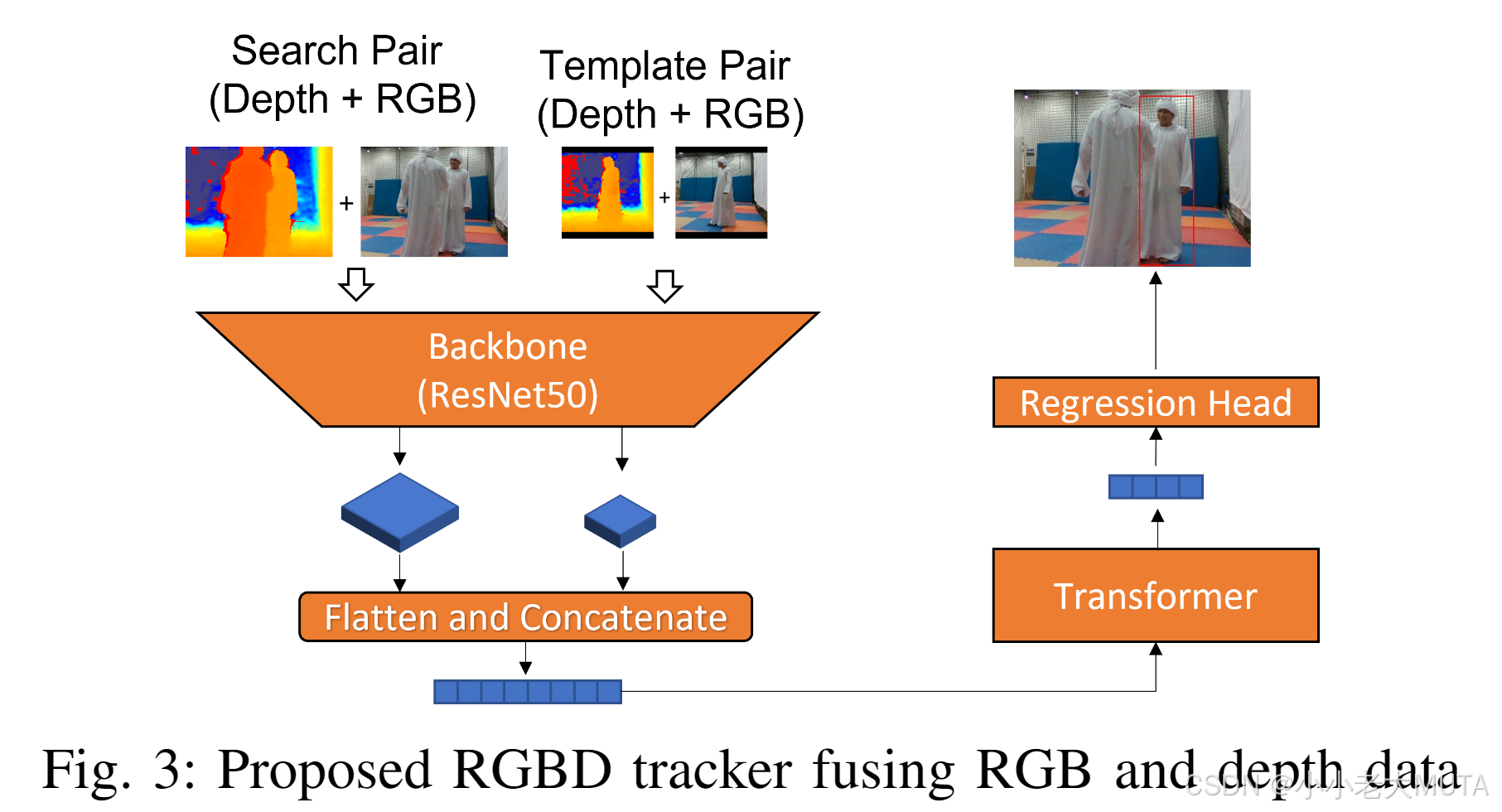 该跟踪器采用了基于变换器(Transformer)的编码器-解码器架构,融合RGB和深度信息,用以区分目标人物与外观相似的干扰物。大量全面的实验结果表明,我们的跟踪器在两个定量评估指标上表现优异,证实其优于其他现有最先进(SOTA)跟踪器。