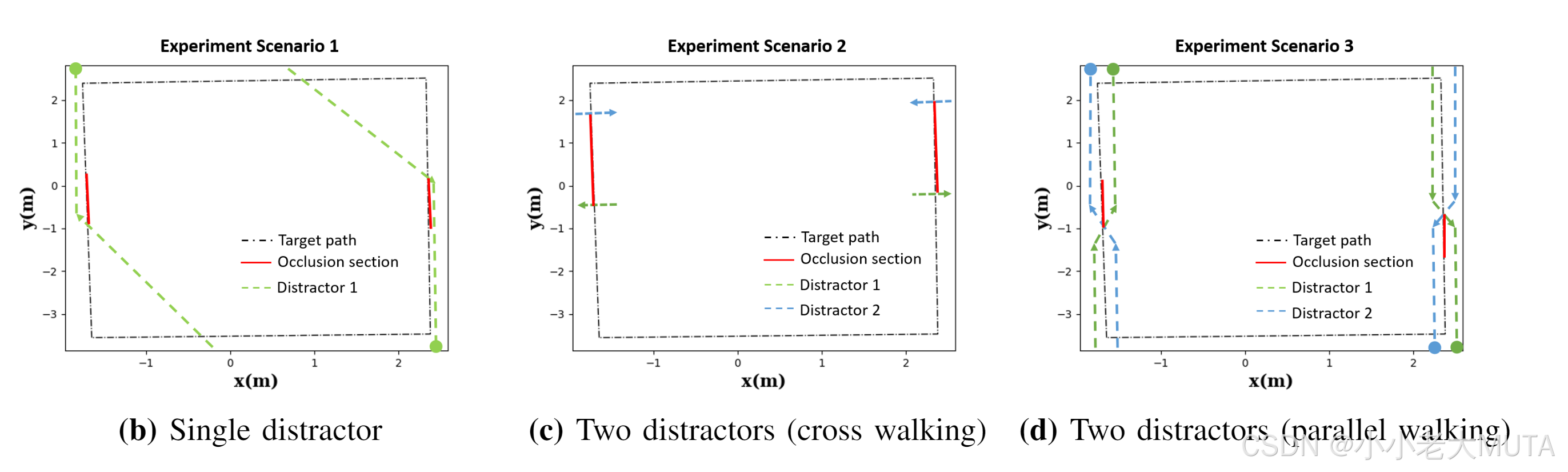 - 单干扰者场景,干扰者横穿路径遮挡目标(图4b);