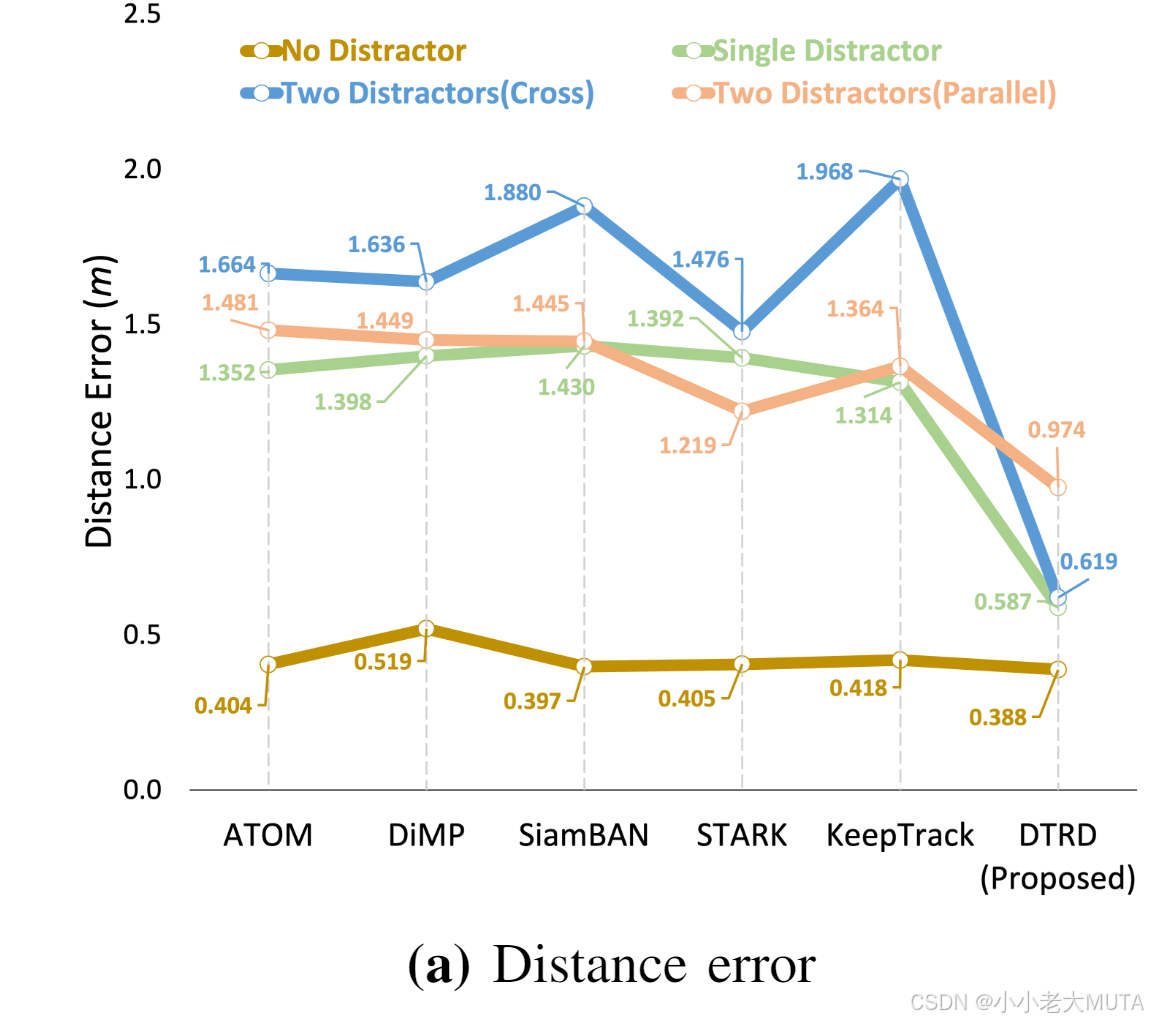距离误差(DE)结果:DE衡量跟踪器预测的目标状态与OptiTrack真实测量距离间的误差,如图5a所示,无干扰时整体DE约为0.5米。但所有2D SOTA跟踪器在存在干扰者时误差显著增加,平均超过1.2米。相比之下,我们的DTRD跟踪器在两干扰者(横穿)场景误差仅约0.6米,虽两干扰者(平行)场景误差稍高,但仍优于其它跟踪器。