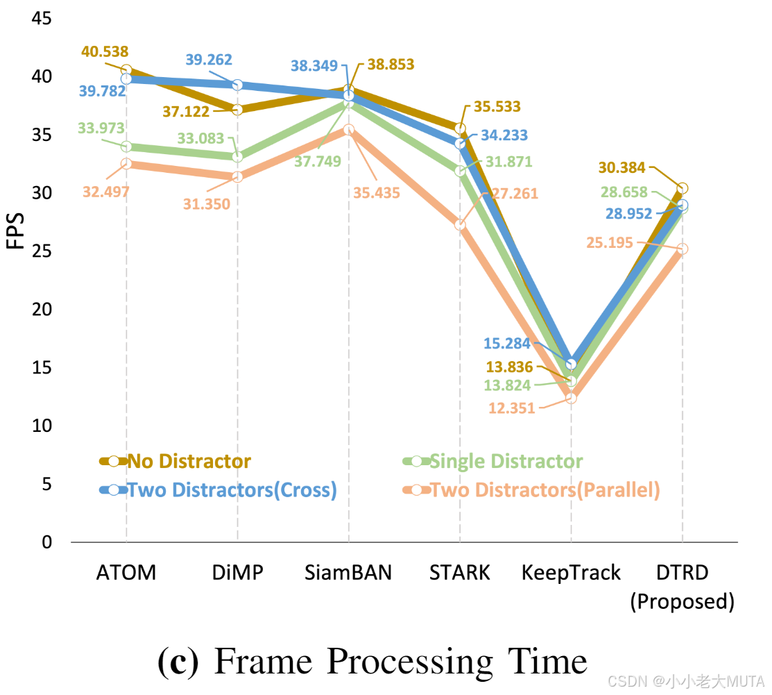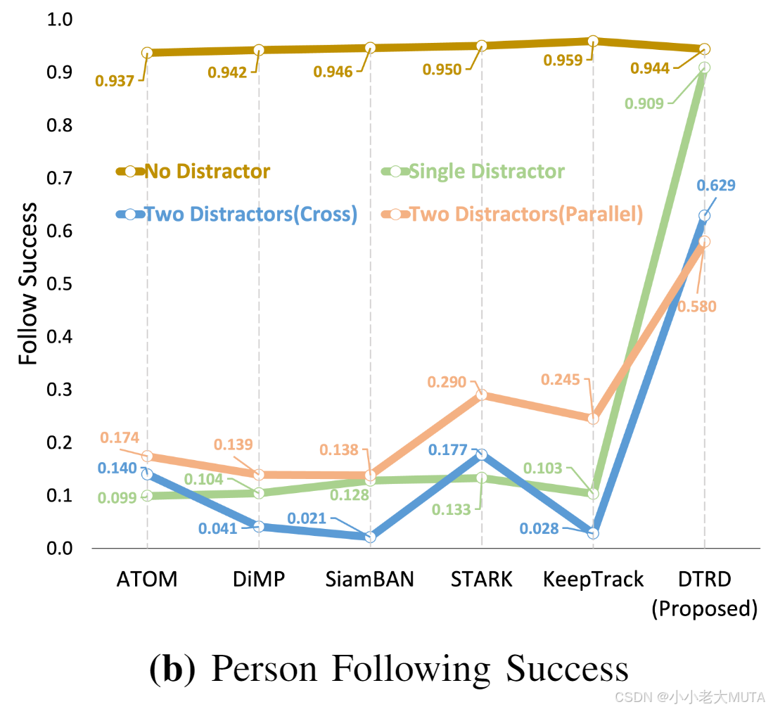 其次,我们观察到DTRD在目标与干扰者保持一定距离时表现良好,但当距离过近时仍会受到干扰。两干扰者场景中约0.6的FS值表明DTRD能抵抗首次干扰,但次次干扰时因间距较小而失败。