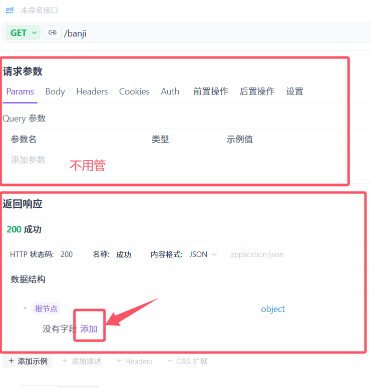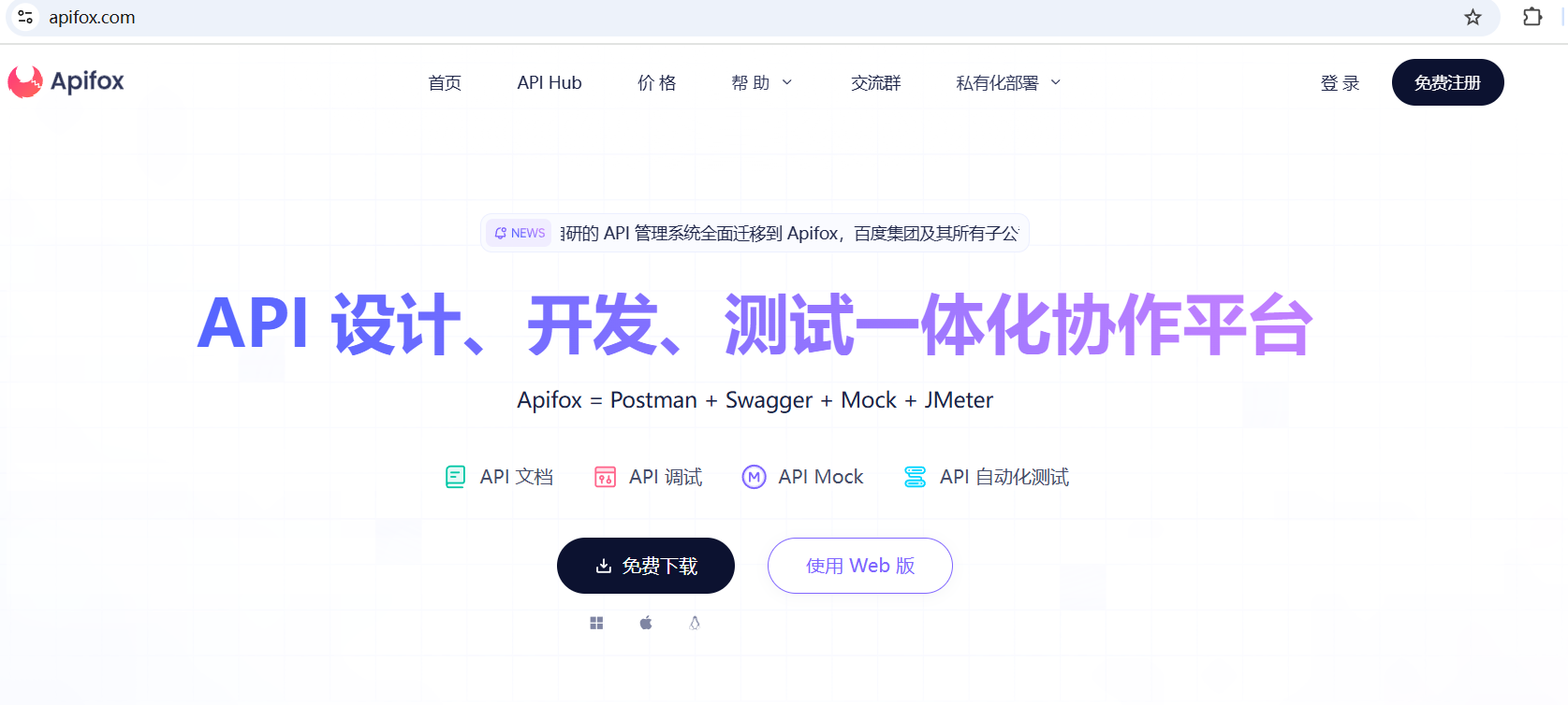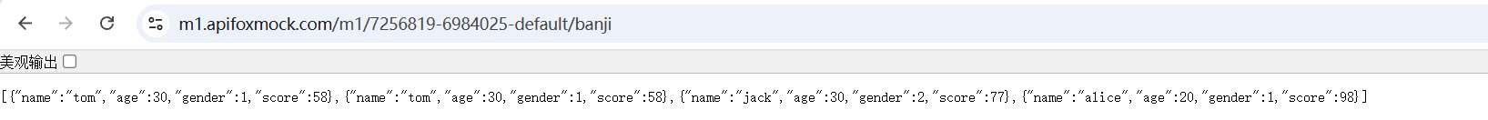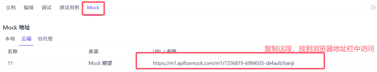 https://apifox.com/ 1、新建项目,再新建接口 2、给接口命名,并给路径一个名字 3、给返回相应添加字段和示例的值。 4、选择“文档”选项卡,在示例右上角,点击“添加为mock期望” 选择“添加为mock期望”,否则返回的数据就是自动生成的数据。 5、选择“mock”选项卡,并开启云mock,会生成一个mock地址。 6、拷贝这个mock地址,并访问,能够看到显示json数据了。