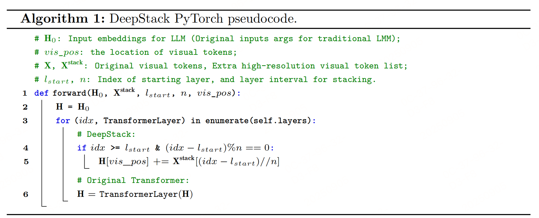 def forward(H0, Xstack, lstart, n, vis_pos):H = H0 # LLM初始隐藏态(含全局视觉token+文本token)for (idx, TransformerLayer) in enumerate(self.layers):# 满足条件时,注入高分辨率堆叠token(残差连接)if idx >= lstart and (idx - lstart) % n == 0:stack_idx = (idx - lstart) // n # 对应Xstack的索引H[vis_pos] += Xstack[stack_idx] # vis_pos:视觉token在隐藏态中的位置# 正常执行LLM的Transformer层计算H = TransformerLayer(H)return H