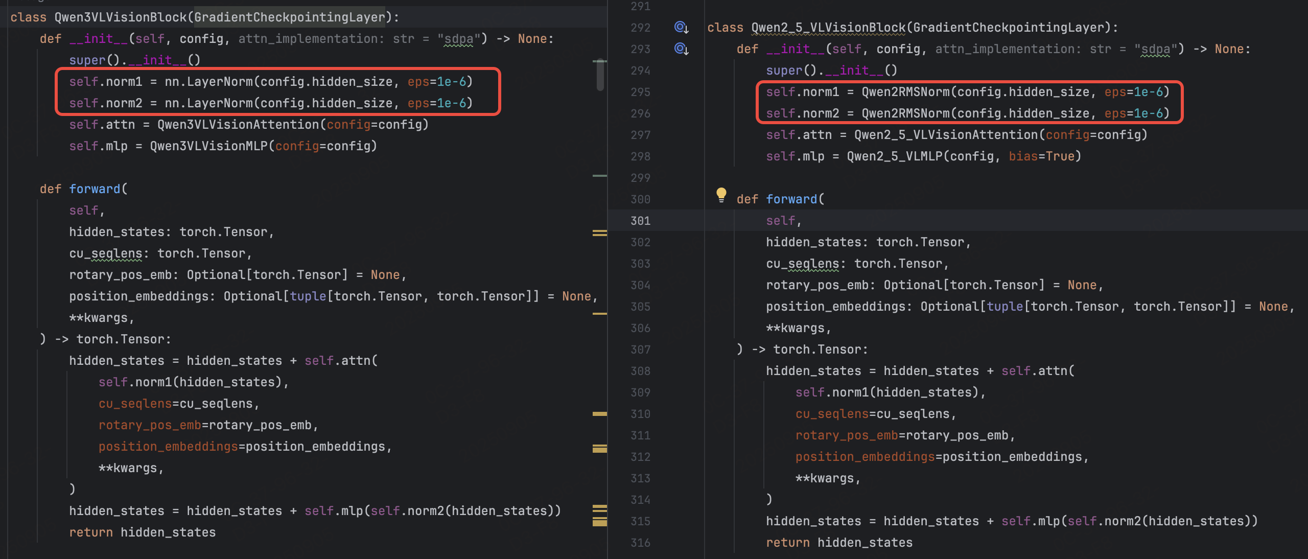 引入可能的 kernel 优化:@use_kernel_forward_from_hub("RMSNorm") class Qwen3VLTextRMSNorm(nn.Module):def forward(self, hidden_states: torch.Tensor) -> torch.Tensor:input_dtype = hidden_states.dtypehidden_states = hidden_states.to(torch.float32)variance = hidden_states.pow(2).mean(-1, keepdim=True)hidden_states = hidden_states * torch.rsqrt(variance + self.variance_epsilon)return self.weight * hidden_states.to(input_dtype)