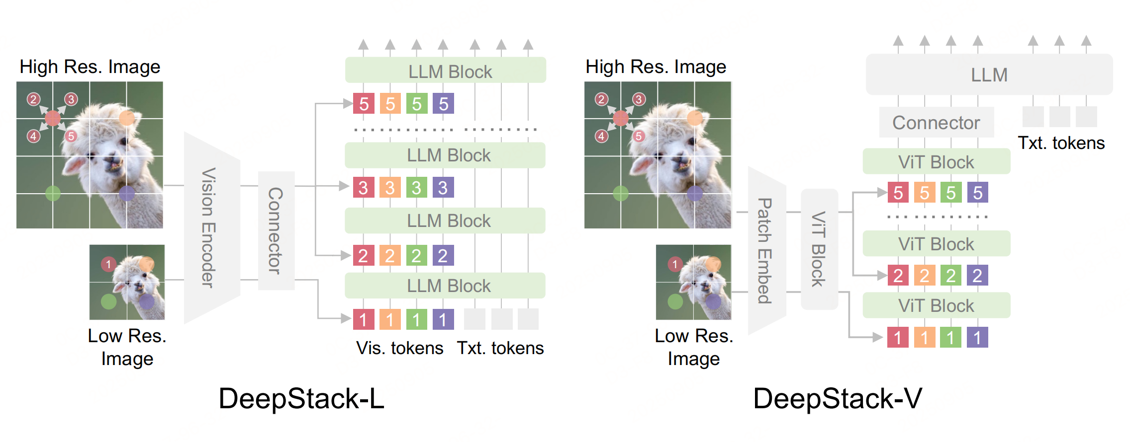 右图:用于 ViTs 的 DeepStack :采用类似的采样策略,但将视觉 token 输入到视觉编码器的 ViT 层中。DeepStack-V 的适配逻辑:利用 ViTs 的编码器分层结构,将高分辨率视觉 token 注入 ViTs 的中间层,而非仅在输入层(PatchEmbed)处理,增强 ViTs 的细粒度特征提取能力。