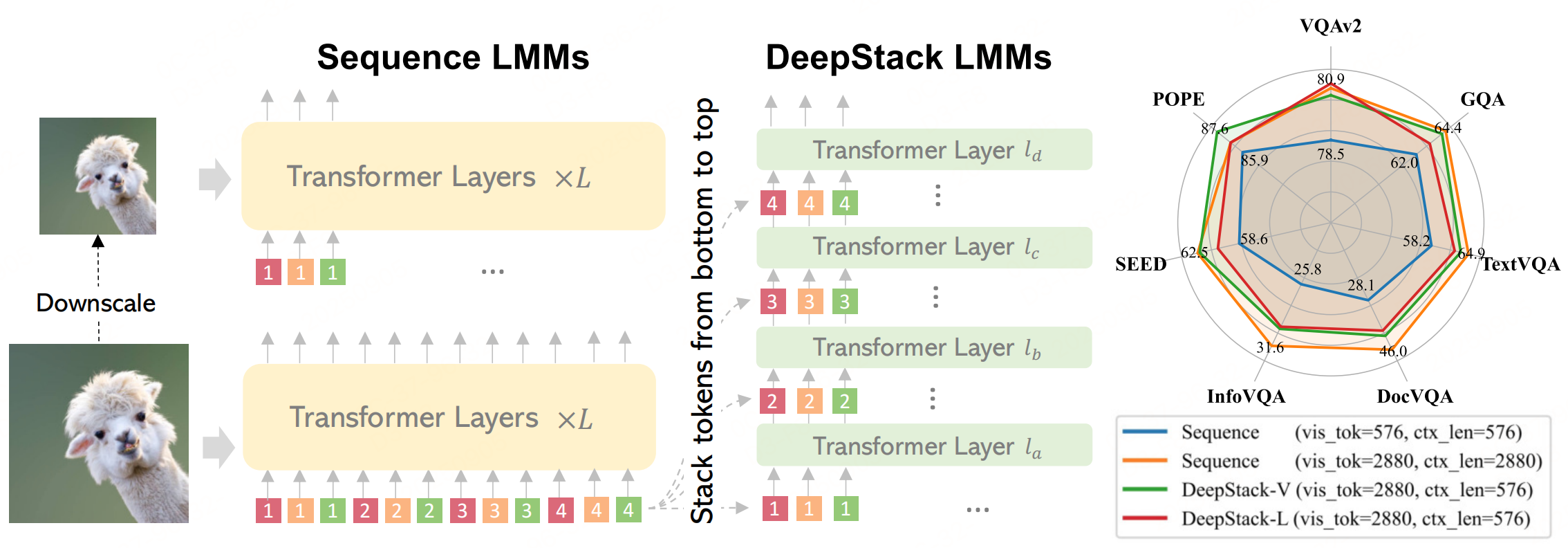 - 中间图: DeepStack LMMs 将 token 堆叠成网格,并自下而上地将其注入到 Transformer 的前几层和中间层,仅通过残差连接实现。