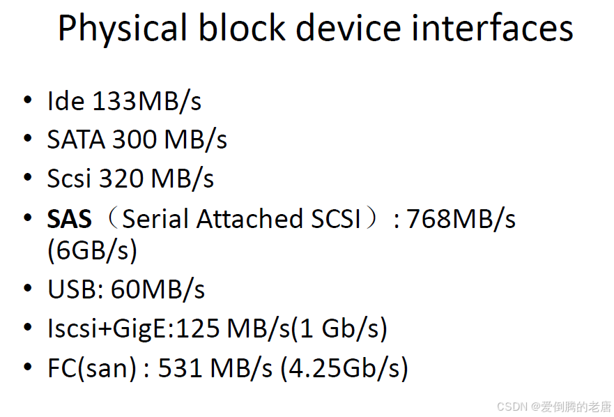 3.4、IOPS:( Input/Output Per Second ) 每秒的输入输出量(或读写次数),即指每秒内系统能处理的 I/O 请求数量。 随机读写频繁的应用,如小文件存储等,关注随机读写性能,IOPS 是关键衡量指标。可以推算出磁盘的 IOPS = 1000ms / (Tseek + Trotation + Transfer),如果忽略数据传输时间,理论上可以计算出随机读写最大的IOPS。常见磁盘的随机读写最大IOPS为:
