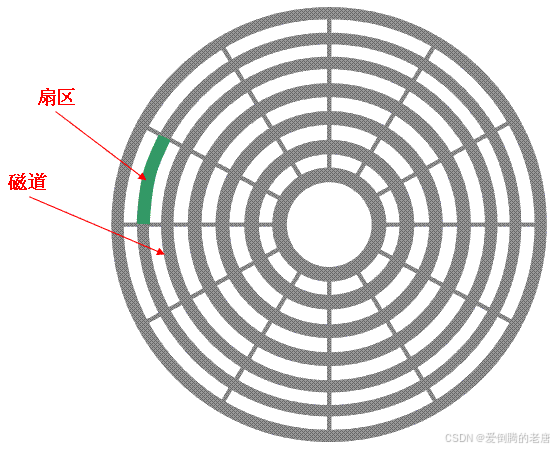 扇区:从圆心向外画直线,可以将磁道划分为若干个弧段,称之为扇区,一个扇区通常为 512B