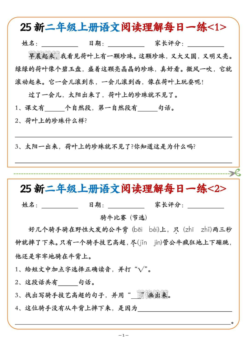 平时让孩子每天做一篇,能逐步提升二年级上册语文阅读理解能力,还能培养良好的阅读习惯,为后续学习打牢基础。
