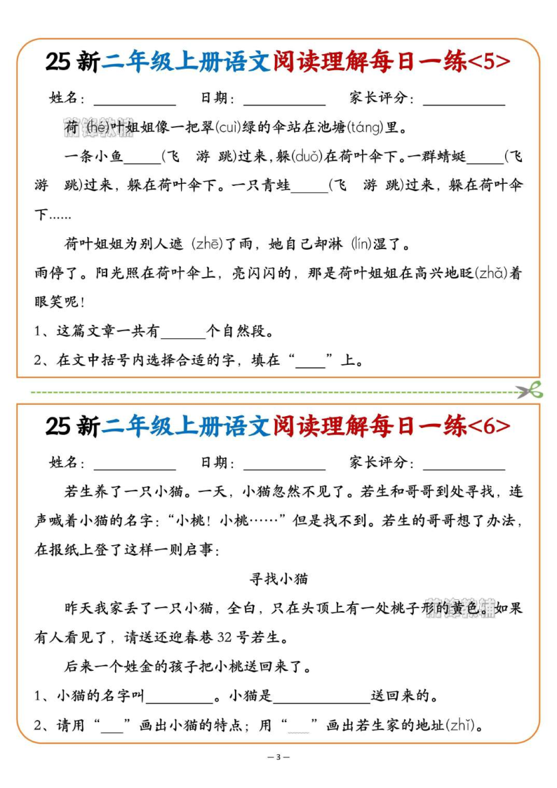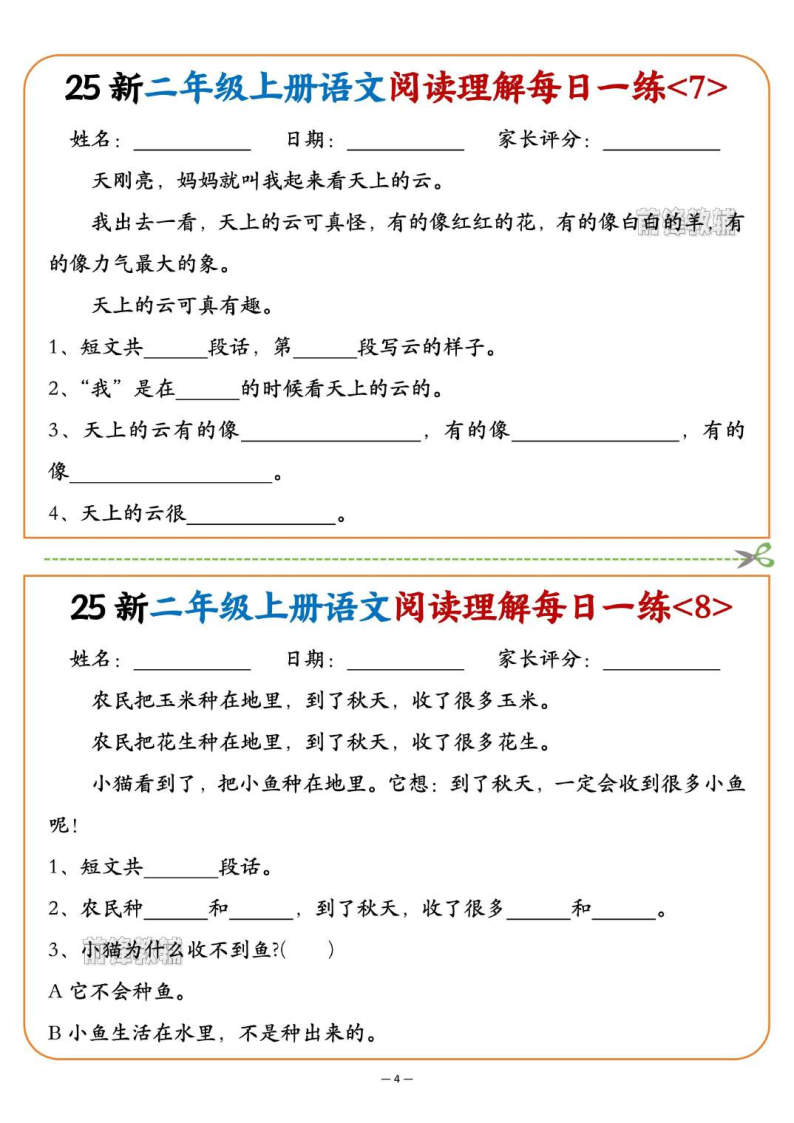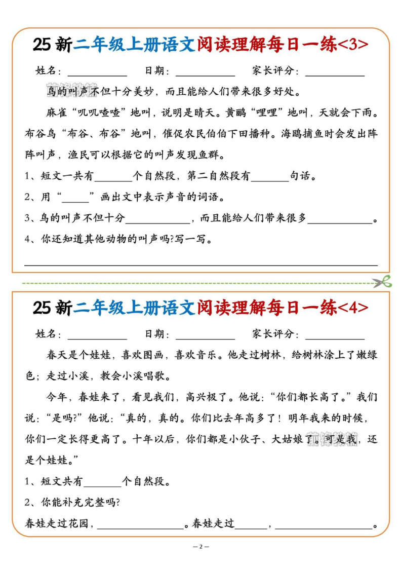 今天给大家分享的是:25新二年级上册语文阅读理解每日一练。高清原图无水印,可直接打印使用。