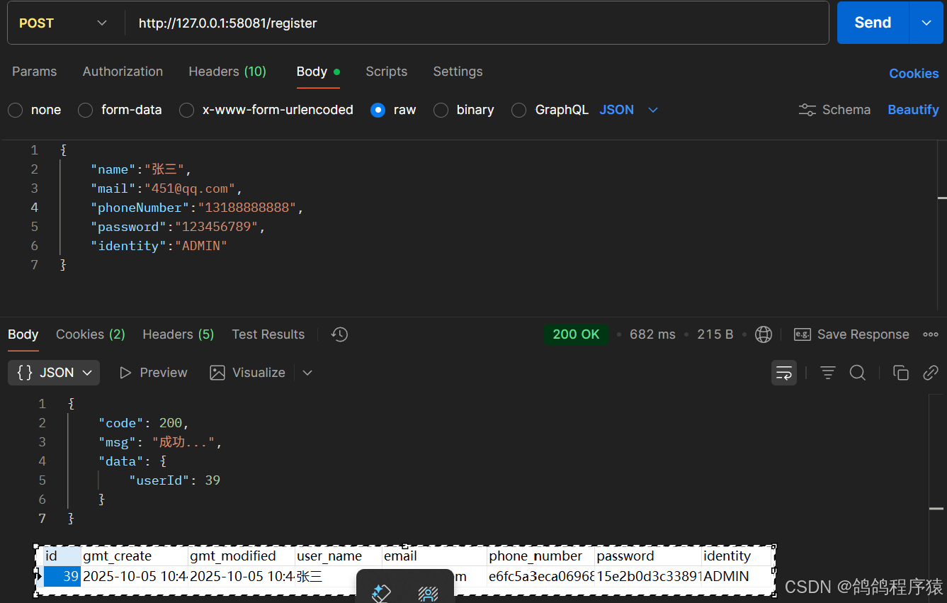 根据接口规范,参数包含 用户名,用户邮箱地址,用户电话,密码,身份标识。出 密码只有管理员有,不是必传参数外,其余都是必传参数, @NotBlank 注解校验String参数,禁止 null、空串、纯空格。