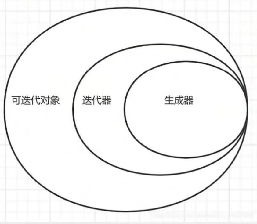 4.三者关系 可迭代对象只实现了python迭代协议,可以通过for...in...循环遍历的对象,比如list、dict、str...、迭代器、生成器 迭代器: 可以记住自己遍历位置的对象,直观体现就是使用next()函数返回值,迭代器只能往前,不能往后(单向),当遍历完毕后,迭代器会抛出异常StopIteration 生成器:是特殊的迭代器,需要注意一下迭代器不一定是生成器,它是python中提供的通过简便的方法写出迭代器的一种手段 包含关系:可迭代对象>迭代器>生成器