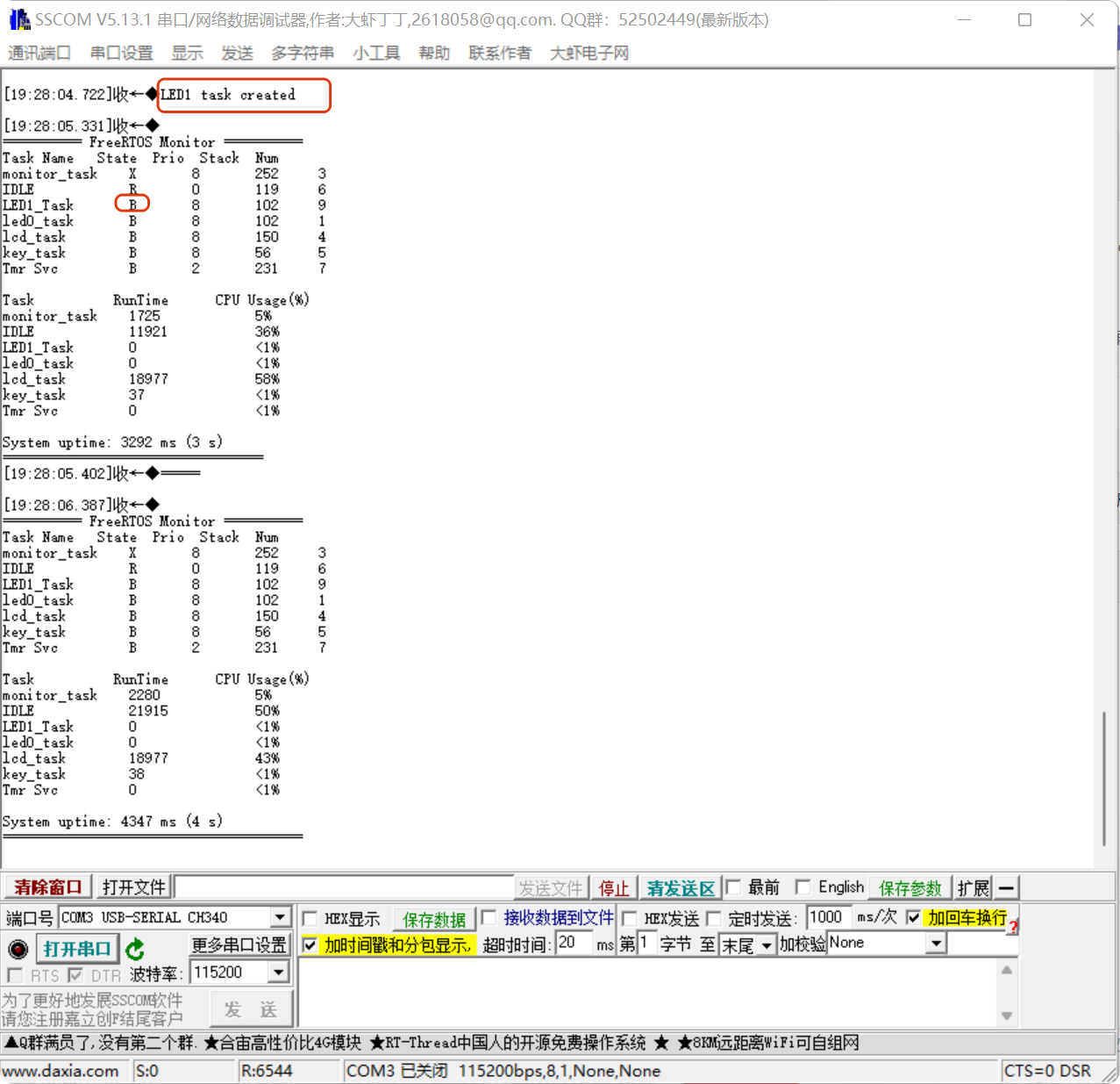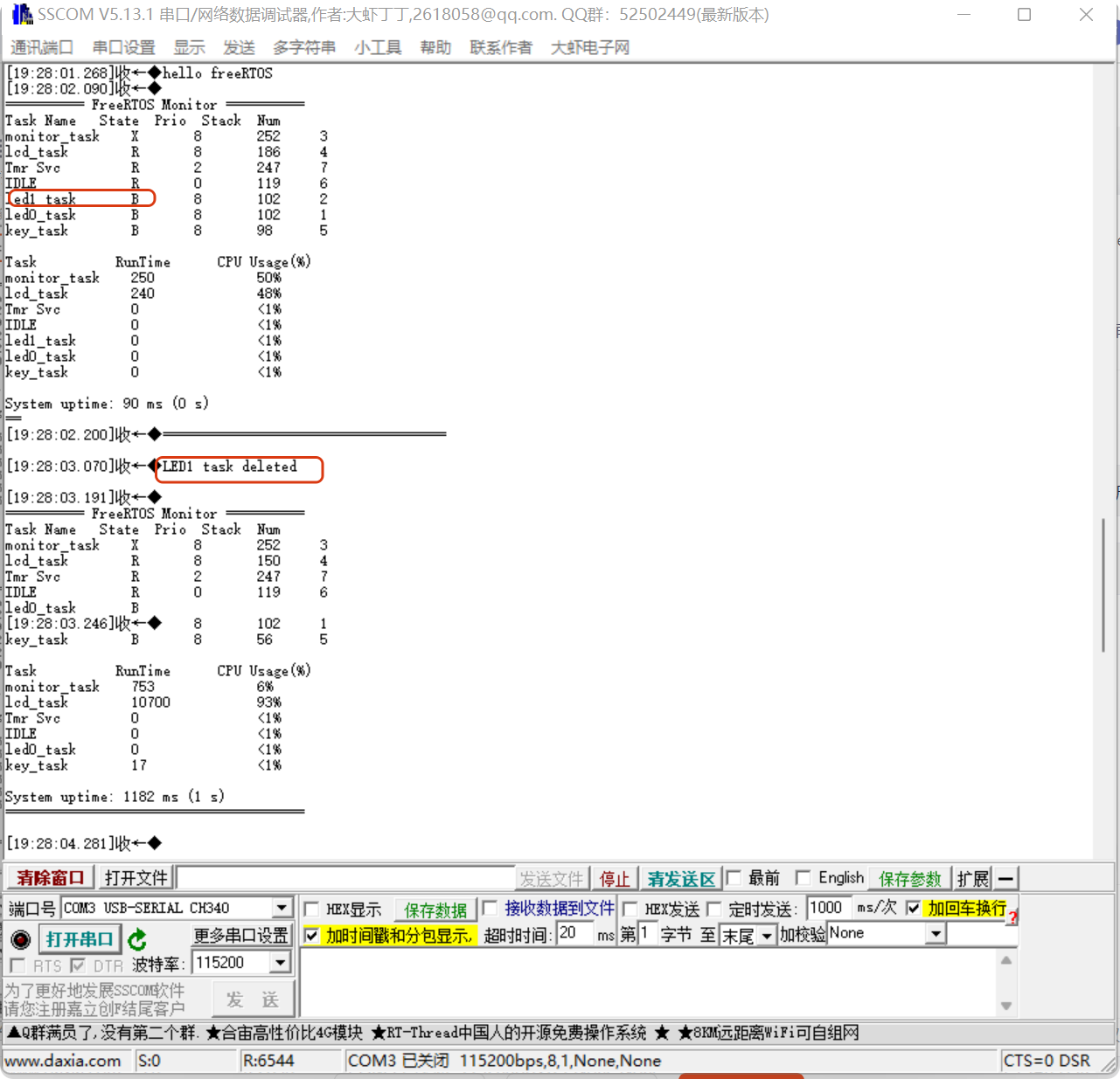 开机时能看到led1_task,按下KEY2后,任务监控列表中没有这个任务了,灯不再闪烁,灯的状态保留最后删除任务那一瞬间。