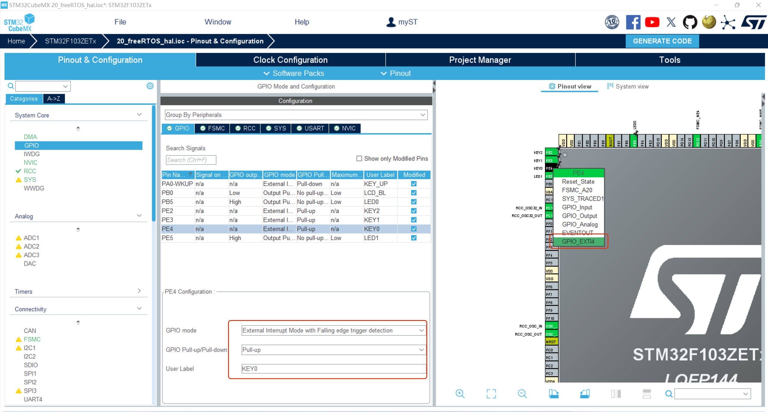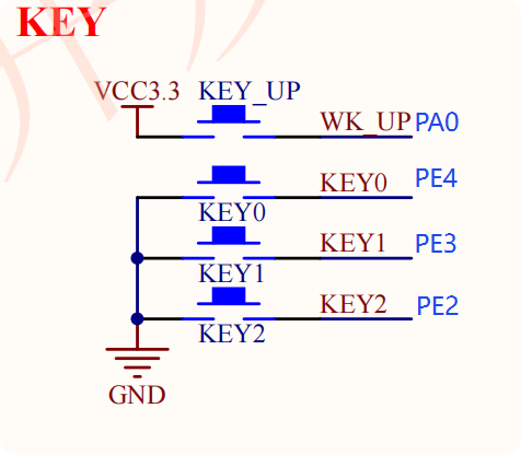 本文使用了PE4 PE3 PE2 PA0四个引脚作为外部中断按键引脚