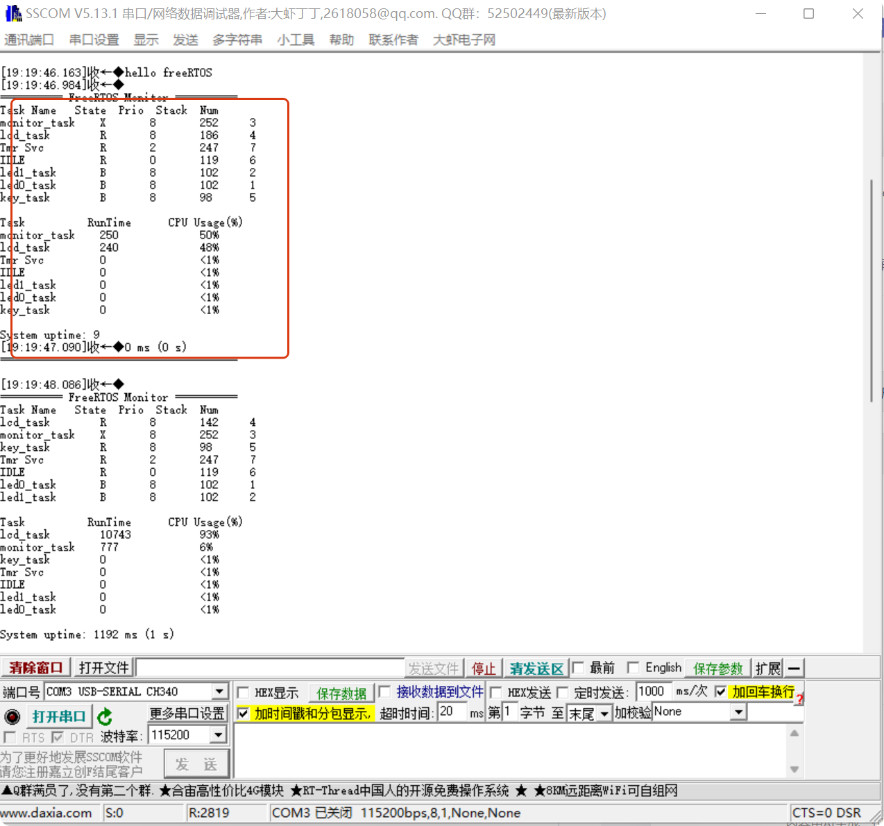 {/* USER CODE BEGIN monitor_task_handler */char taskListBuf[256];char runTimeStatsBuf[512];/* Infinite loop */for(;;){printf("\r\n========== FreeRTOS Monitor ==========\r\n");// 1️⃣打印任务列表(任务名称�?�状态�?�优先级、剩余栈空间、任务编号)vTaskList(taskListBuf);printf("Task Name State Prio Stack Num\r\n%s\r\n", taskListBuf);// 2️⃣ 打印 CPU 利用率和运行时间统计vTaskGetRunTimeStats(runTimeStatsBuf);printf("Task RunTime CPU Usage(%%)\r\n%s\r\n", runTimeStatsBuf);// 3️⃣ 打印系统启动时间(毫�????????? / 秒)printf("System uptime: %lu ms (%lu s)\r\n", osKernelGetTickCount(), osKernelGetTickCount()/1000);printf("======================================\r\n");osDelay(1000); // 延时 1 秒,循环刷新状�??}/* USER CODE END monitor_task_handler */