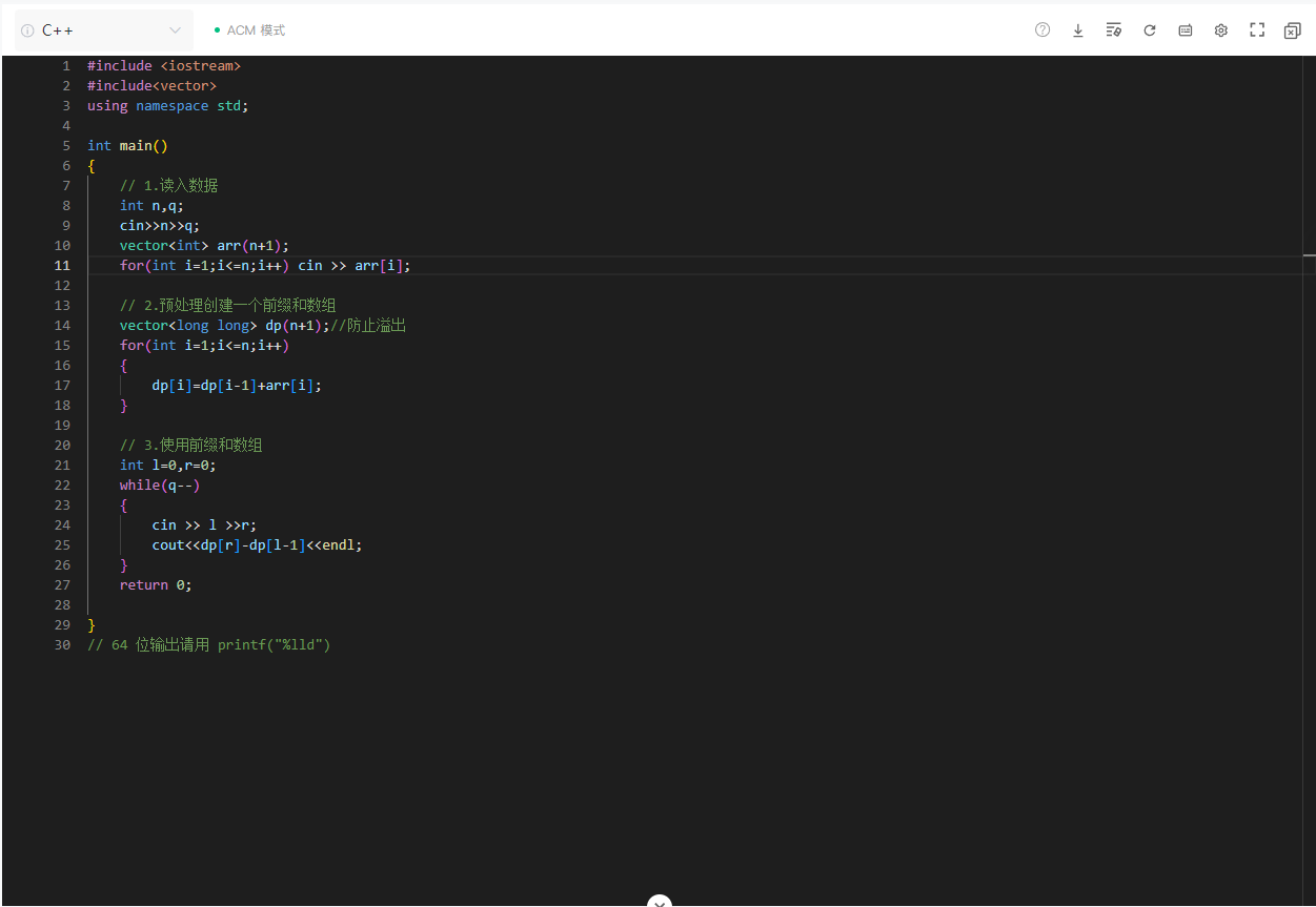 vector<long long> dp(n + 1); // 用long long防止整数溢出 for (int i = 1; i <= n; i++) {dp[i] = dp[i - 1] + arr[i]; }