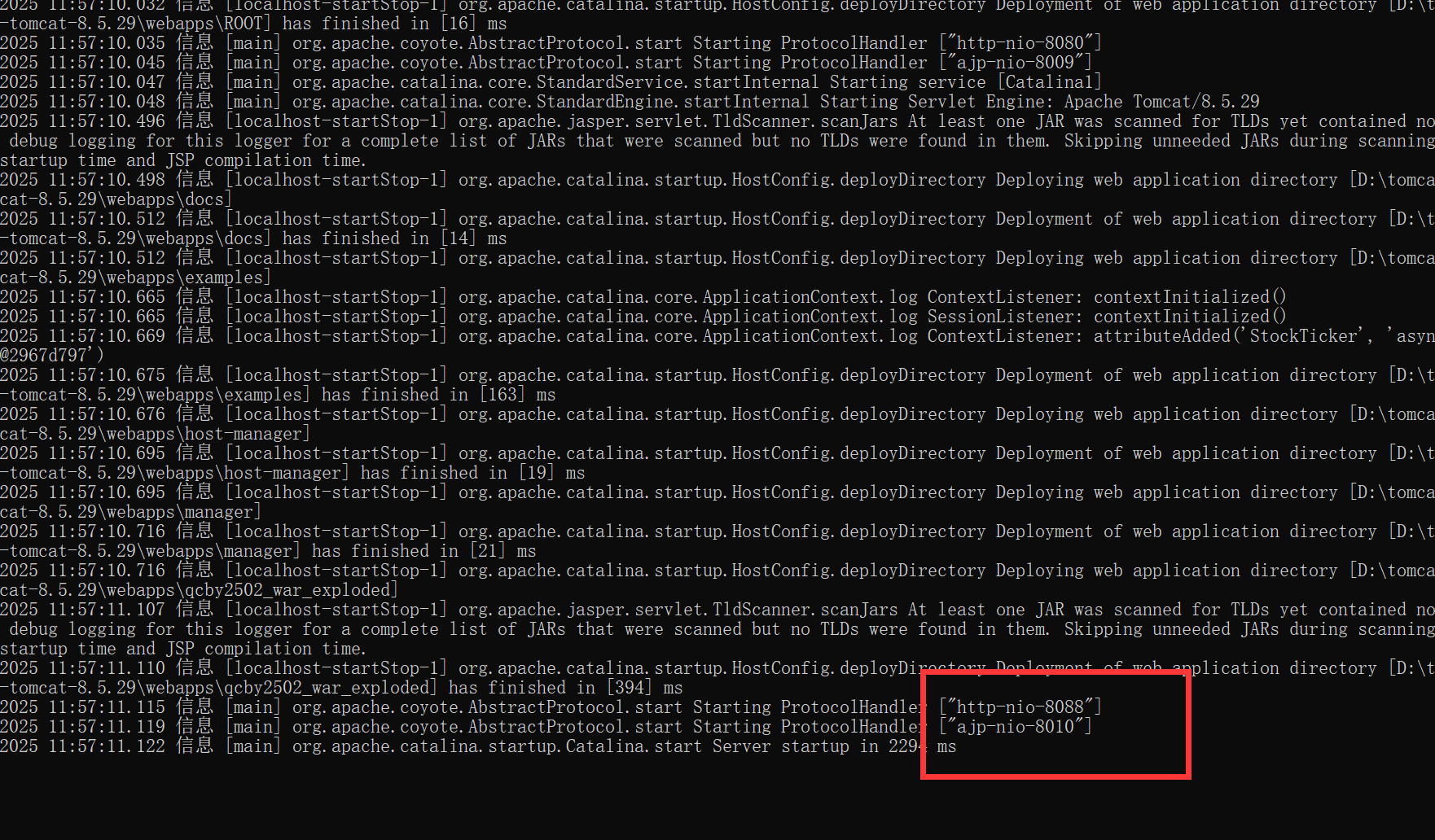 <Service name="Catalina1"><!-- 每个项目的端口号也要进行区分,保证不被占用 --><Connector port="8088" protocol="HTTP/1.1"connectionTimeout="20000"redirectPort="8443" URLEncoding="UTF-8"/><!-- 这里的AJP端口同样也要进行区分 --><Connector port="8010" protocol="AJP/1.3" redirectPort="8443" secretRequired=""/><Engine name="Catalina1" defaultHost="localhost"><Realm className="org.apache.catalina.realm.LockOutRealm"><Realm className="org.apache.catalina.realm.UserDatabaseRealm"resourceName="UserDatabase"/></Realm><Host name="localhost" appBase="webapps"unpackWARs="true" autoDeploy="true"><Valve className="org.apache.catalina.valves.AccessLogValve" directory="logs"prefix="localhost_access_log" suffix=".txt"pattern="%h %l %u %t "%r" %s %b" /><!-- 这里是想要部署的对应项目的名称 --><Context docBase="qcby2502_war_exploded" path="/" reloadable="true"/></Host></Engine></Service>