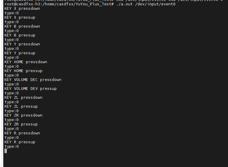 {struct yuyou_plus in_ev = {0};int fd = -1;unsigned char type = 0;unsigned char code = 0;unsigned short val = 0;/* 校验传参 */if (2 != argc) {fprintf(stderr, "usage: %s <input-dev>\n", argv[0]);exit(-1);}/* 打开文件 */if (0 > (fd = open(argv[1], O_RDONLY))) {perror("open error");exit(-1);}for ( ; ; ) {/* 循环读取数据 *///printf ("\nstruct size:%d\n", sizeof(struct yuyou_plus) );//int i = read(fd, &in_ev, sizeof(struct yuyou_plus));//int i = read(fd, &in_ev, 16);//printf ("\n read size:%d \n", i);if (16 != read(fd, &in_ev, 16)) {perror("read error");exit(-1);}switch(in_ev.type){case TYPE_KEY:{ //printf("type:KEY code:%x value:%d\n", in_ev.code, in_ev.value1);switch(in_ev.code){case CODE_KEY_X:{if(in_ev.value1){printf("KEY X pressdown\n");}else{printf("KEY X pressup\n");}}break;case CODE_KEY_B:{if(in_ev.value1){printf("KEY B pressdown\n");}else{printf("KEY B pressup\n");}}break;case CODE_KEY_Y:{if(in_ev.value1){printf("KEY Y pressdown\n");}else{printf("KEY Y pressup\n");}}break;case CODE_KEY_A:{if(in_ev.value1){printf("KEY A pressdown\n");}else{printf("KEY A pressup\n");}}break;case CODE_KEY_ZL:{if(in_ev.value1){printf("KEY ZL pressdown\n");}else{printf("KEY ZL pressup\n");}}break;case CODE_KEY_ZR:{if(in_ev.value1){printf("KEY ZR pressdown\n");}else{printf("KEY ZR pressup\n");}}break;case CODE_KEY_L:{if(in_ev.value1){printf("KEY L pressdown\n");}else{printf("KEY L pressup\n");}}break;case CODE_KEY_R:{if(in_ev.value1){printf("KEY R pressdown\n");}else{printf("KEY R pressup\n");}}break;case CODE_KEY_VOL_DEC:{if(in_ev.value1){printf("KEY VOLUME DEC pressdown\n");}else{printf("KEY VOLUME DEC pressup\n");}}break;case CODE_KEY_VOL_INC:{if(in_ev.value1){printf("KEY VOLUME INC pressdown\n");}else{printf("KEY VOLUME INC pressup\n");}}break;case CODE_KEY_HOME:{if(in_ev.value1){printf("KEY HOME pressdown\n");}else{printf("KEY HOME pressup\n");}}break;default:{}break;}}break;case TYPE_MISC:{//printf("type:MISC code:%d value:%d\n", in_ev.type, in_ev.code, in_ev.value);}break;case TYPE_MOVE:{//printf("type:MOVE code:%x value:%d\n", in_ev.code, in_ev.value1);switch(in_ev.code){case CODE_MOVE_LEFT_X: {printf("MOVE LEFT X (val:%d)\n", in_ev.value1);}break;case CODE_MOVE_LEFT_Y: {printf("MOVE LEFT Y (val:%d)\n", in_ev.value1);}break;case CODE_MOVE_RIGHT_X:{printf("MOVE RIGHT X (val:%d)\n", in_ev.value1);}break;case CODE_MOVE_RIGHT_Y:{printf("MOVE RIGHT Y (val:%d)\n", in_ev.value1);}break;case CODE_KEY_UP_DOWN:{static int flag_up_down = 0; // 0: none 1: up 2: downif(0xffff==in_ev.value1){flag_up_down = 1;printf("KEY DIR UP pressdown\n");}else if(1==in_ev.value1){flag_up_down = 2;printf("KEY DIR DOWN pressdown\n");}else if(0==in_ev.value1){if(1==flag_up_down){printf("KEY DIR UP pressup\n");}else if(2==flag_up_down){printf("KEY DIR DOWN pressup\n");}flag_up_down = 0;}}break;case CODE_KEY_LEFT_RIGHT:{static int flag_left_right = 0; // 0: none 1: left 2: rightif(0xffff==in_ev.value1){flag_left_right = 1;printf("KEY DIR LEFT pressdown\n");}else if(1==in_ev.value1){flag_left_right = 2;printf("KEY DIR RIGHT pressdown\n");}else if(0==in_ev.value1){if(1==flag_left_right){printf("KEY DIR LEFT pressup\n");}else if(2==flag_left_right){printf("KEY DIR RIGHT pressup\n");}flag_left_right = 0;}}break;default:{}break;}}break;default:{printf("type:%x\n", in_ev.type); }break;}}