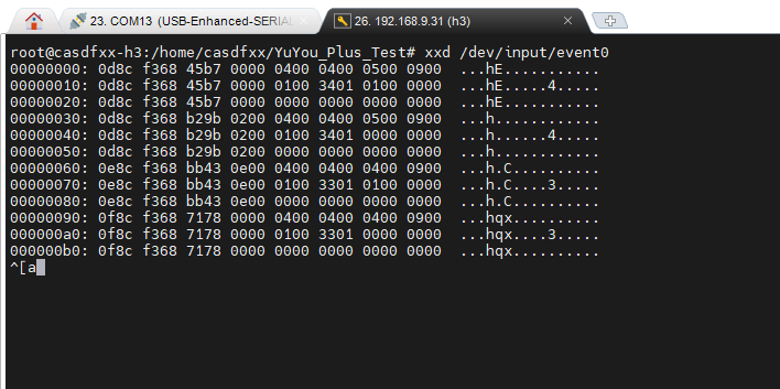 将它插上天嵌h3仅有的一个USB口,发现/dev/input/event0有补枚举出来,来看看输出是什么样子的: