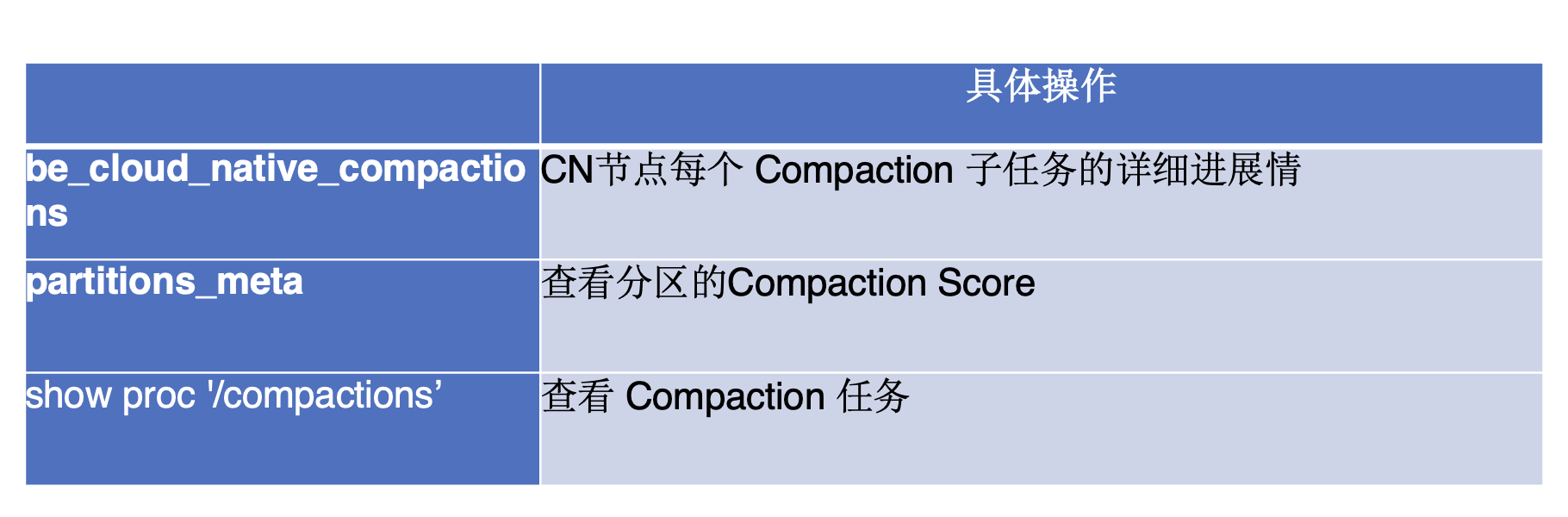 此外,利用 show proc compactions 命令,可以获取具体的 Compaction 任务信息,包括任务的开始与结束时间、总执行时长,以及本地与远端数据的扫描量。例如,当远端数据的扫描量偏高时,往往提示需要检查 DataCache 的配置是否过小,从而为性能优化提供参考。