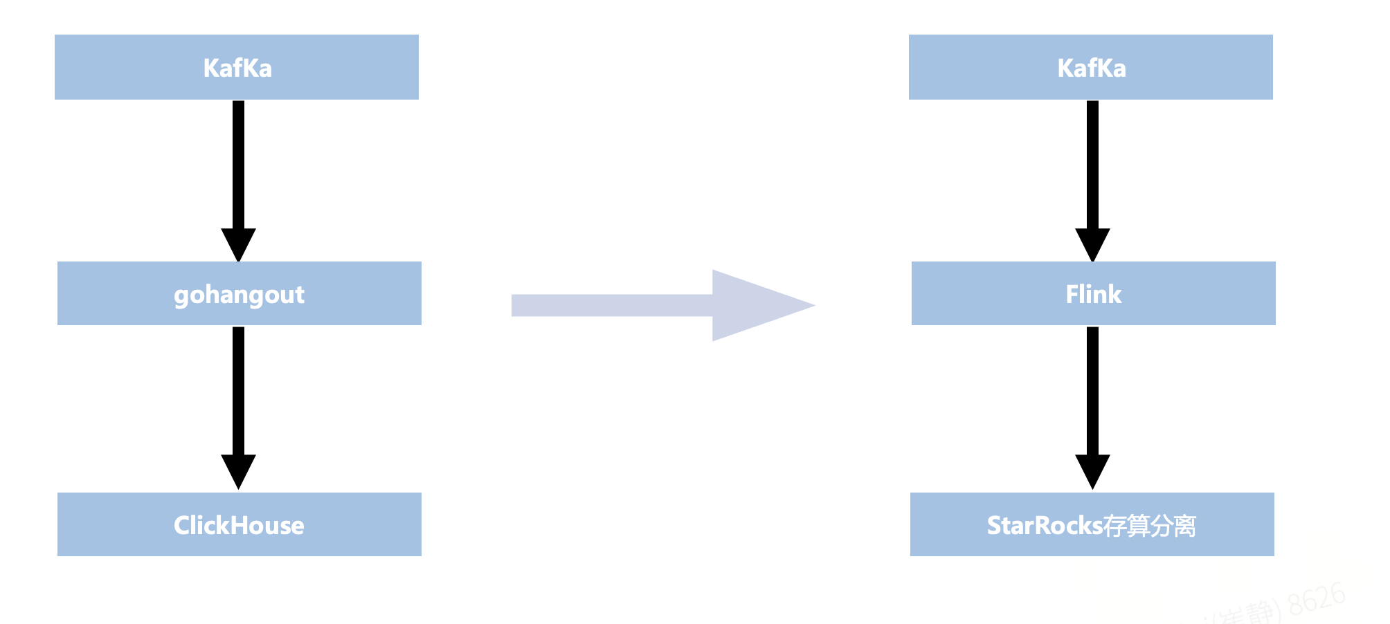 本次改造的重点在于上图中红色框标注部分——即 gohangout + ClickHouse,最终将其替换为 Flink + StarRocks。