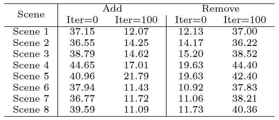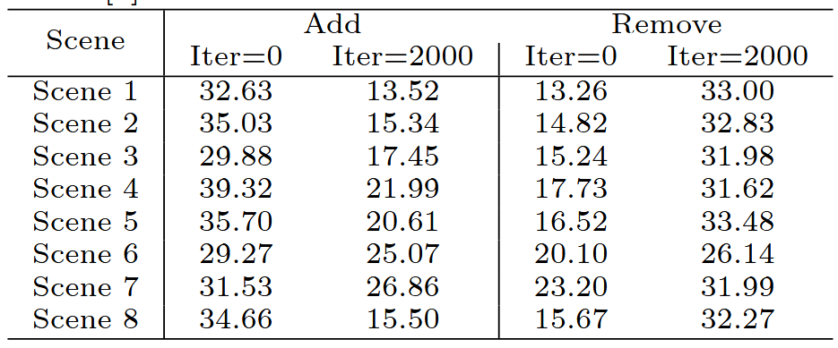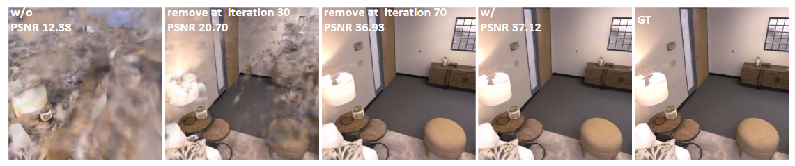 (a)使用TensoRF [9]对副本数据集[8]的场景1进行新颖的视图合成。我们使用如[10]中的训练配置,并在测试集上比较PSNR。“在迭代 70 时删除”的性能接近“w/”。 w/o PSNR 65.42 在迭代 30 时删除 PSNR 68.37 在迭代 30 时删除