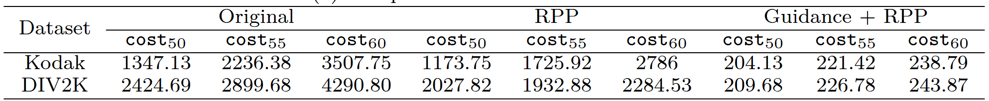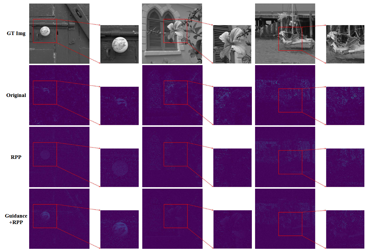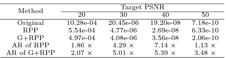 误差模式。图5显示了不同策略的误差图。“原始”表现出更厚的波纹模式,而“RPP”引入了细粒度噪声。“引导+RPP”呈现出结构化模式以及细粒度噪声。表III显示了不同方法在不同目标PSNR水平下的像素损失方差。与“RPP”相比,“引导+RPP”在PSNR 50 dB时导致较低的误差,尽管在PSNR 40 dB时显示出较高的误差;“引导+RPP”学习特定模式并找到更有效的方法,尽管在此过程中经历了暂时的误差增加,但最终导致改进的结果
