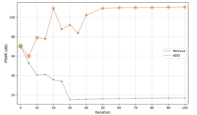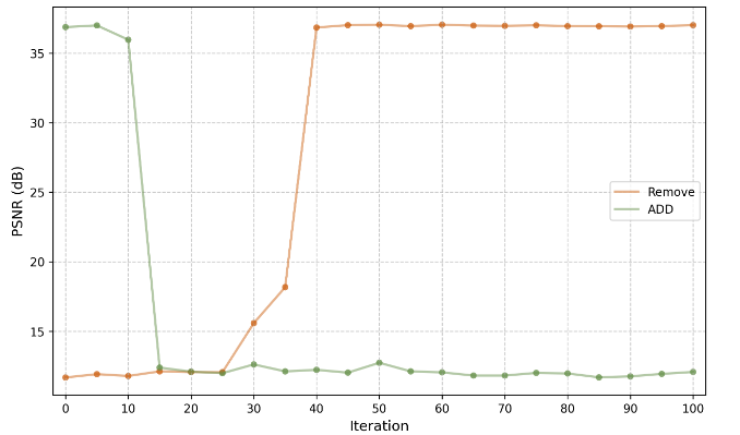 遵循[13],我们使用SIREN[12]来拟合来自DIV2K数据集的单张图像,应用随机像素排列(RPP)进行数据转换,遵循他们的配置,同时在不同的迭代中通过添加或移除SSIM损失来修改它。具体来说,“添加”意味着我们在不使用SSIM损失的情况下开始网络训练,然后在特定的迭代中引入它。相反,“移除”意味着我们开始时与SSIM损失一起训练,但在某个迭代中将其移除。
