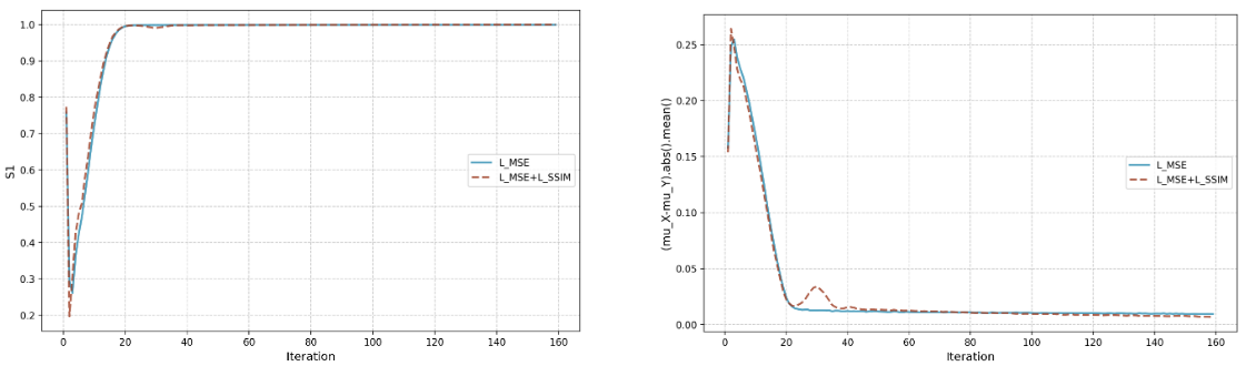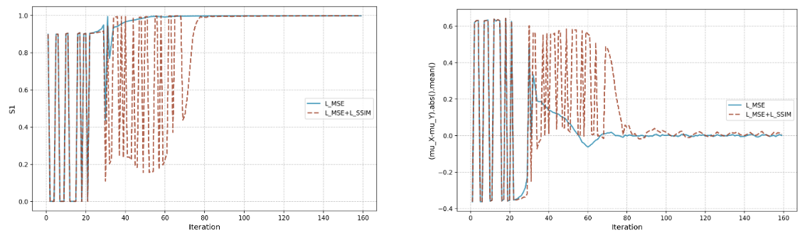 的收敛趋势与IV-B小节中描述的现象密切相关,如图3所示。结合图2可以看出:SSIM损失在训练过程中,在亮度收敛之前(即亮度收敛)起着至关重要的作用。通过比较仅使用