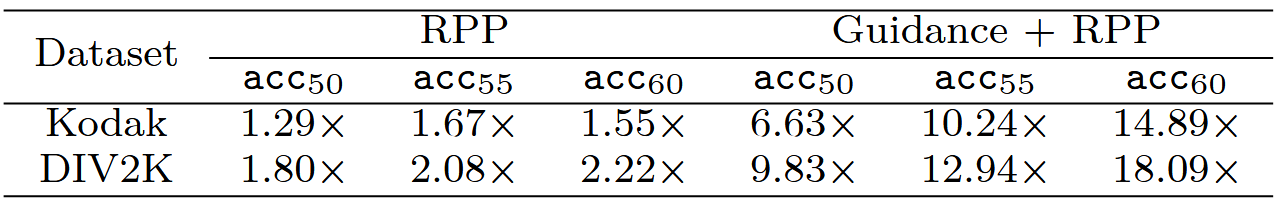 结果。我们重新运行他们的官方代码,并使用指标acc50、acc55和acc60比较表IIa中的加速因子;此外,我们还在表IIb中比较了实现目标PSNR所需的平均步数。“引导”机制提高了性能,使其在Kodak和DIV2K数据集上都“更快”和“更好”。随着目标PSNR的增加,我们的方法显示出更大的性能增益。当目标PSNR设置为60 dB时,Kodak数据集上的平均cost60为221.42,对于“引导+RPP”,而“RPP”为2786。相应地,acc60指标为1.55对比14.89。这可以归因于SSIM损失帮助找到“引导+RPP”中神经场参数空间的更好“线性表达”。