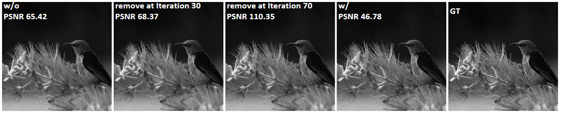 图1:结构相似性(SSIM)损失与神经场训练中的“引导”机制很好地配对。当学习了亮度后,消除 SSIM 损耗不会影响最终性能,甚至可能提高最终性能。“w/o”:训练过程中不使用 SSIM 丢失;“remove at iteration M ”:SSIM 损失在训练开始时应用,但在迭代 M 时删除;w/“:SSIM 损失在整个训练过程中应用。
