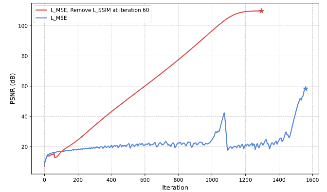 如图2a和2b所示,在某些迭代中从训练过程中移除SSIM损失可以使优化“更快”和“更好”。例如,当在迭代60时移除SSIM损失时,PSNR在迭代1295时达到大约109 dB。相比之下,在某些迭代中将SSIM损失添加到训练过程中可能会损害性能;似乎网络的某些属性已经建立,添加SSIM损失可能不再提供显著的正向改进。基于图2a中呈现的实验比较,在整个训练阶段使用SSIM损失并没有带来性能的提升,这表明使用SSIM损失的方式可能对于最大化其益处至关重要。此外,如图2b所示,与仅依赖整个训练过程中的MSE损失相比,额外使用SSIM损失并在迭代60时移除它有助于神经场参数快速找到一个更好的“线性快车道”,从而实现更高的性能。