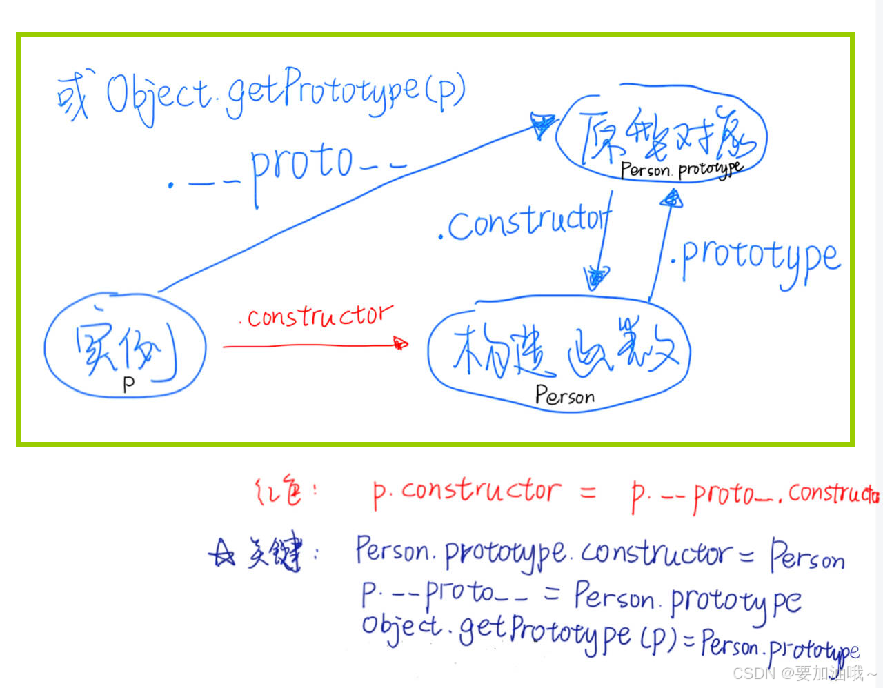 (注: p为实例,Person构造函数,Person.prototype为构造函数的原型。)