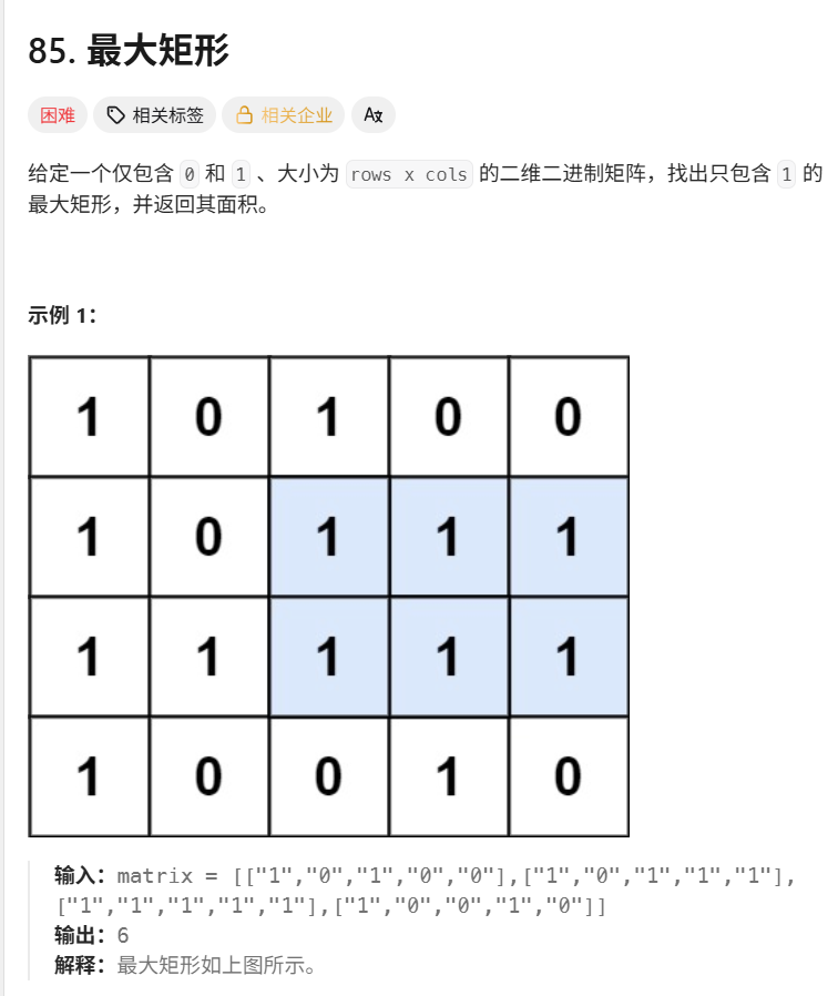 public:int maximalRectangle(vector<vector<char>>& matrix) {if (matrix.empty() || matrix[0].empty()) {return 0;}int m = matrix.size();int n = matrix[0].size();vector<int> heights(n, 0);int maxArea = 0;for (int i = 0; i < m; ++i) {// 1. 更新 heights 数组for (int j = 0; j < n; ++j) {if (matrix[i][j] == '1') {heights[j] += 1;} else {heights[j] = 0;}}// 2. 调用 LC 84 的解法maxArea = max(maxArea, largestRectangleInHistogram(heights));}return maxArea;}private:// LeetCode 84: 柱状图中最大的矩形 (单调栈解法)int largestRectangleInHistogram(vector<int>& heights) {stack<int> s;heights.push_back(0); // 哨兵,确保所有柱子都能被弹出计算int maxArea = 0;for (int i = 0; i < heights.size(); ++i) {while (!s.empty() && heights[s.top()] >= heights[i]) {int h = heights[s.top()];s.pop();int w = s.empty() ? i : i - s.top() - 1;maxArea = max(maxArea, h * w);}s.push(i);}heights.pop_back(); // 恢复原状 (好习惯)return maxArea;}