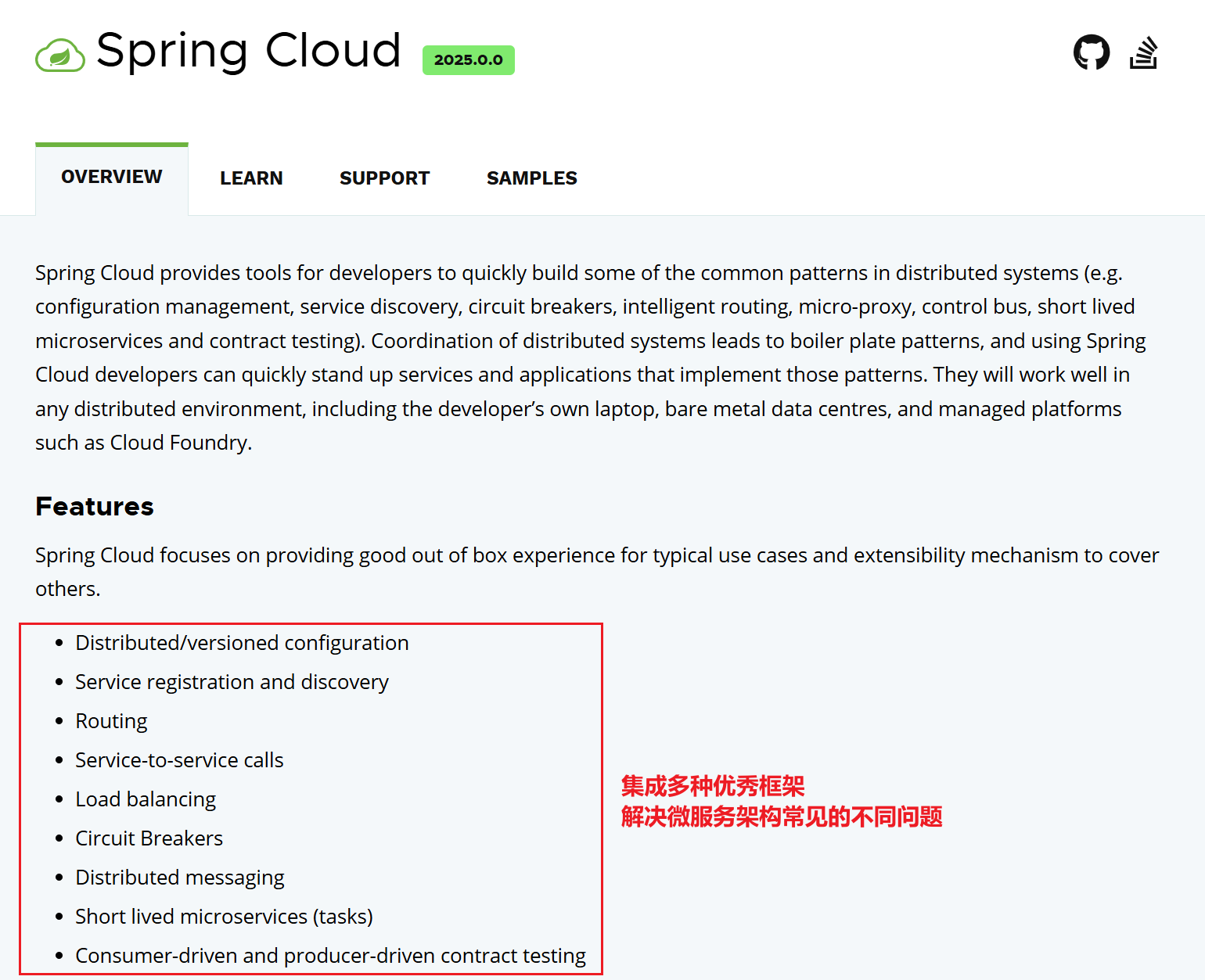 Spring Cloud 是分布式微服务架构的一站式解决方案,它不是 Spring 团队所研发的框架,而是将多种解决了微服务架构常见问题的优秀架构,使用 Spring Cloud 规范集成,并用 Spring Boot 封装,更便于开发者使用。
