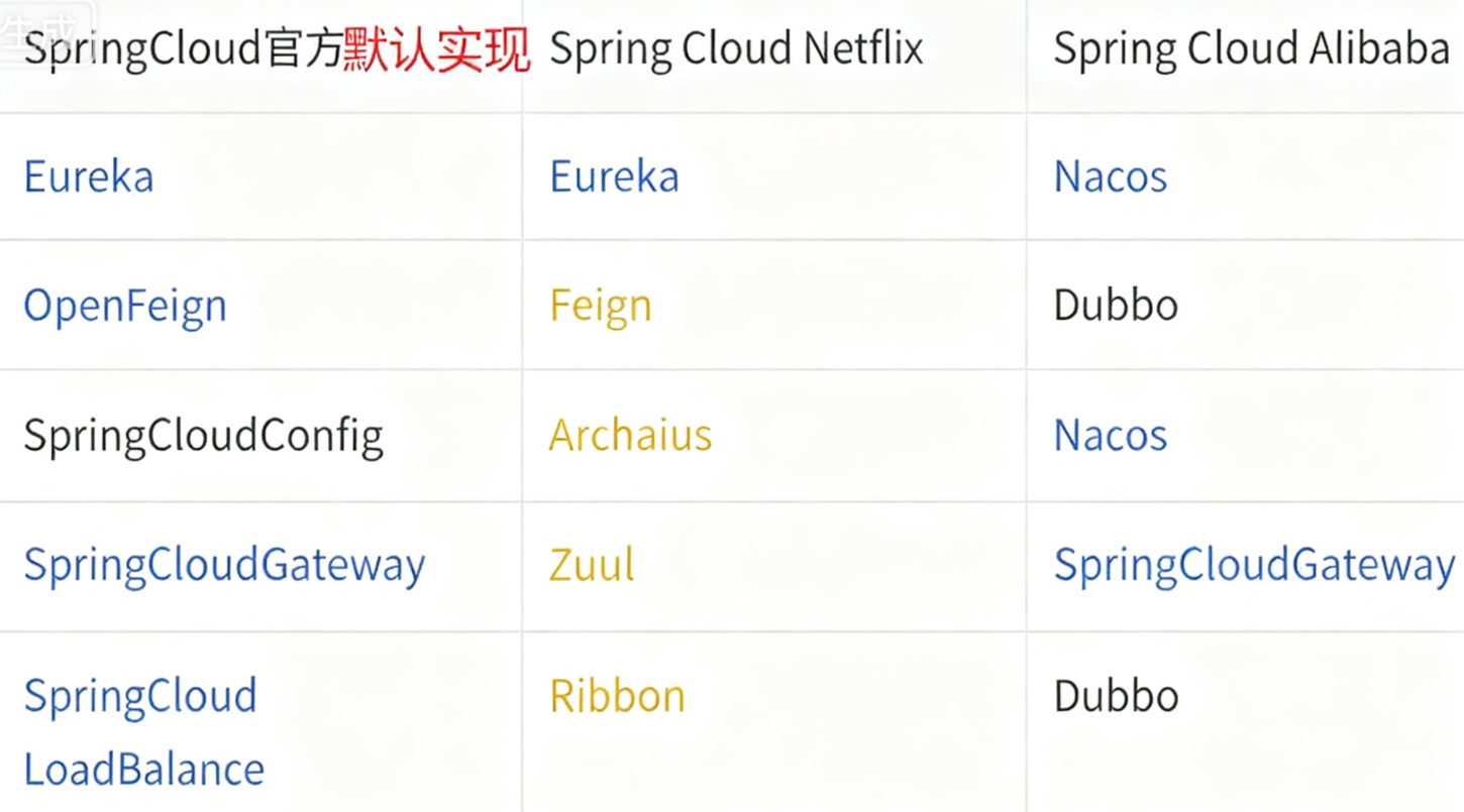 Spring Cloud 的第一代实现 Spring Cloud Netflix,但 Netflix 公司后来停止维护很多组件,官方 Spring Cloud 现在只保留了 Eureka。后来由阿里巴巴集团研发的 Spring Cloud Alibaba 逐渐成为主流微服务框架。