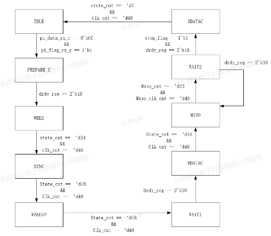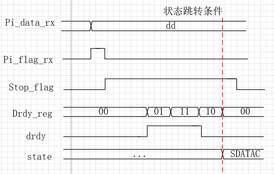 endalways @(posedge clk ) beginif (rst_n == 0) begin// resetstate <= 'd0;endelse case (state)IDLE: beginif (pi_flag_rx == 1'b1 && pi_data_rx == 8'hcc) beginstate <= PREPARE_C;endelse beginstate <= IDLE;endendPREPARE_C: beginif (drdy_reg == 2'b10) beginstate <= WREG;endelse beginstate <= PREPARE_C;endendWREG: beginif (state_cnt == STATE_CNT_MAX && clk_cnt == CLK_CNT_MAX) beginstate <= SYNC_S;endenddefault: state <= IDLE;endcase