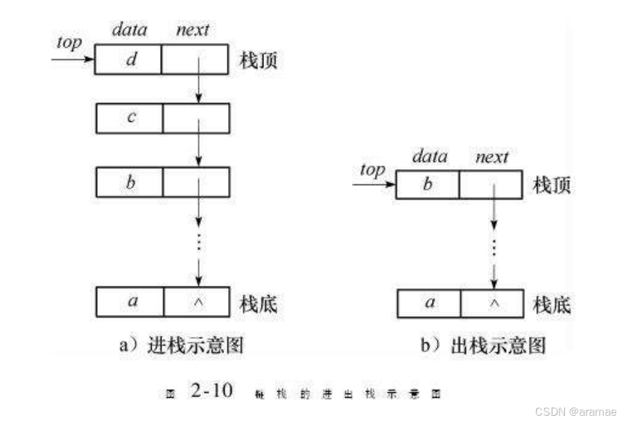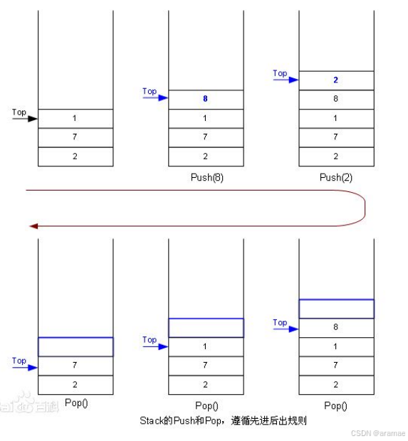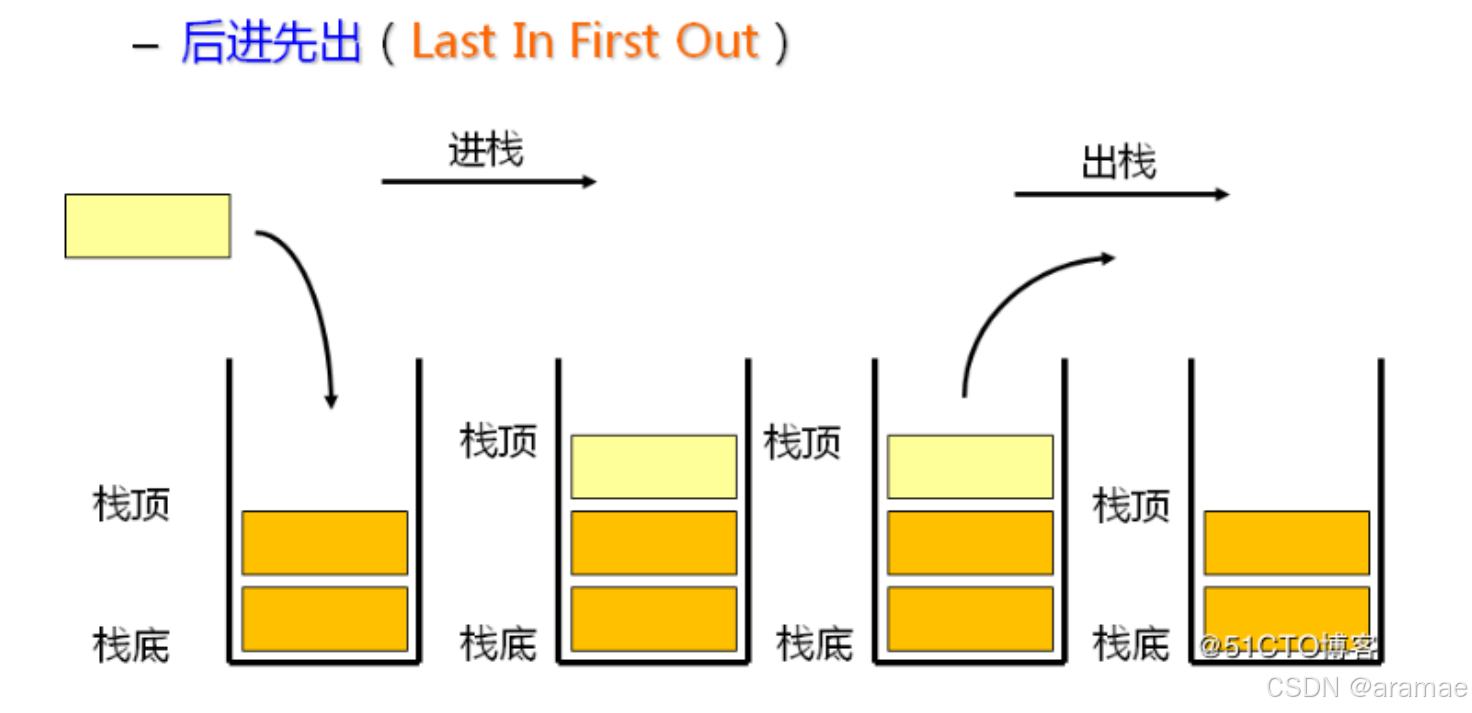 - 出栈:栈的删除操作叫做出栈。出数据也在栈顶。