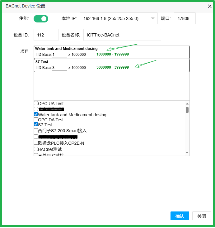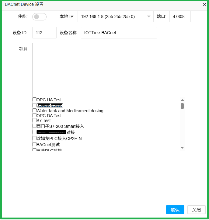 在对话框下方是本地IOT-Tree运行实例中的项目列表,你可以勾选需要对外提供BACnet访问的项目。