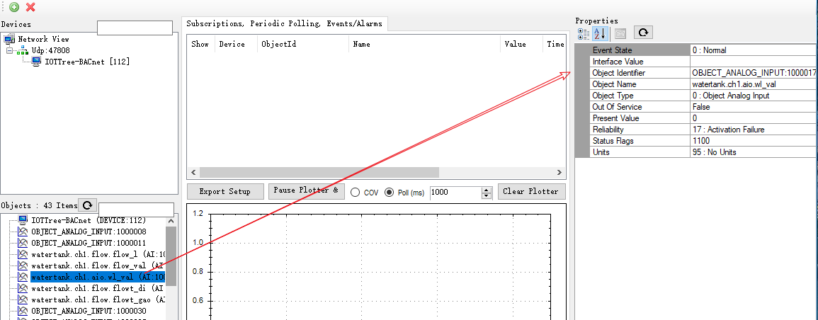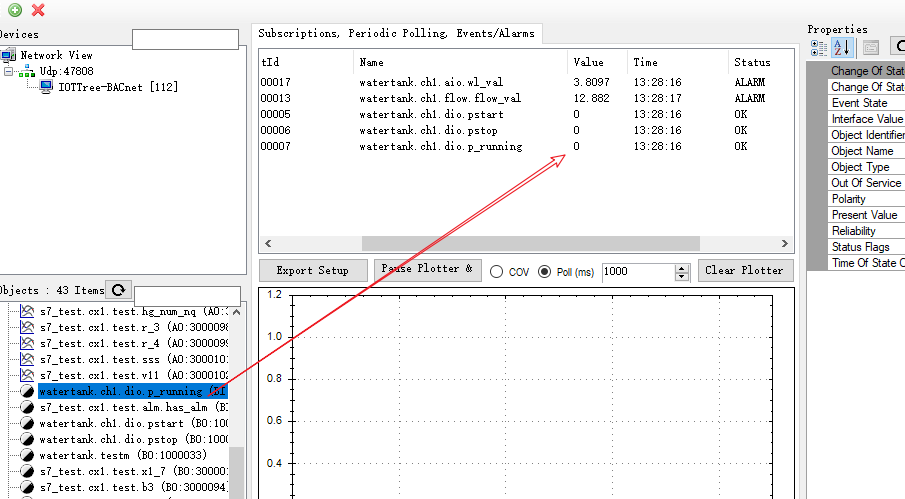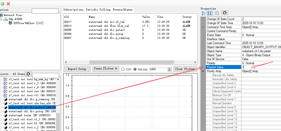 如对于数据点“watertank.ch1.dio.pstart”,这是IOT-Tree内部自带Demo项目中的手工启动水泵标签,选中之后,在Properties区的Present Value属性项,写入1并回车。就会在IOT-Tree端触发写入指令。
