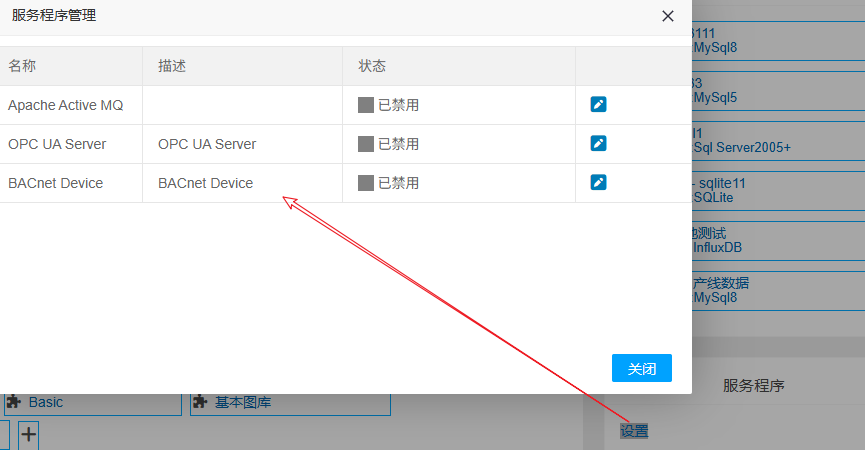 IOT-Tree Server直接提供对外BACnet设备模拟支持,通过内置BACnet Service方式提供。在IOT-Tree Server管理主界面中,点击"服务程序"的"设置”按钮,就可以在弹出对话框列中看到“BACnet Device”这个服务程序。你可以设置这个服务程序的参数或控制启动停止。如图: