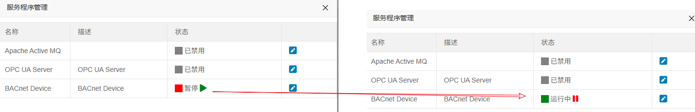 以上参数设置成功之后,在Service列表中,点击启动服务按钮,本IOT-Tree Server运行实例就支持BACnet Device了