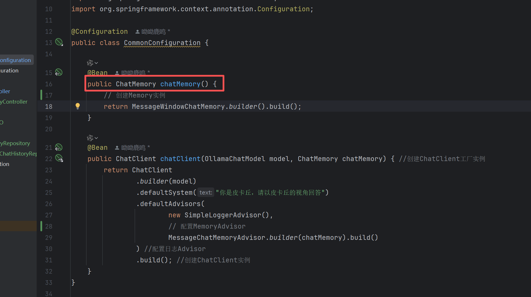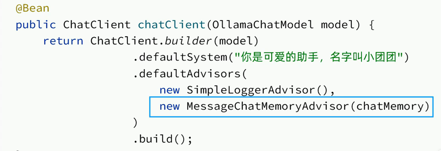 public class CommonConfiguration {@Beanpublic ChatMemory chatMemory() {// 创建Memory实例return MessageWindowChatMemory.builder().build();}@Beanpublic ChatClient chatClient(OllamaChatModel model, ChatMemory chatMemory) { //创建ChatClient工厂实例return ChatClient.builder(model).defaultSystem("你是皮卡丘,请以皮卡丘的视角回答").defaultAdvisors(new SimpleLoggerAdvisor(),// 配置MemoryAdvisorMessageChatMemoryAdvisor.builder(chatMemory).build()) //配置日志Advisor.build(); //创建ChatClient实例}