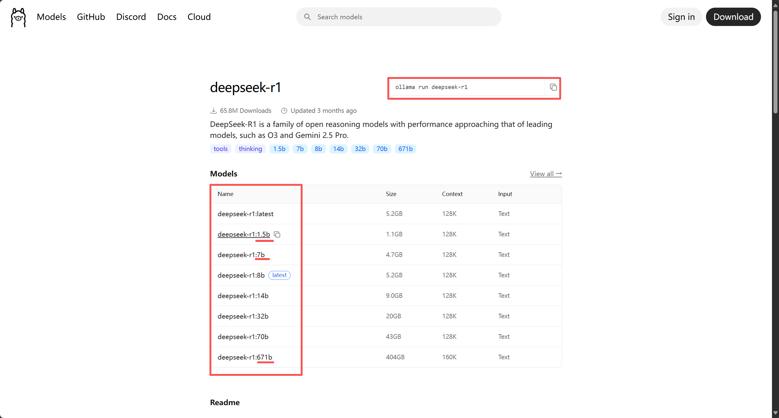 点击你要选择的大模型,下面会有许多版本让你选择,后面的1.5b,7b指的是它的算力,数值越大对电脑配置要求越高,数值最大的就是我们说的满血版,其余都是阉割版,右上角是对应使用的命令,打开命令提示符并输入指令它就会自动为你下载。